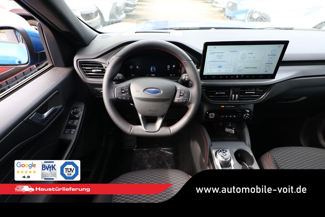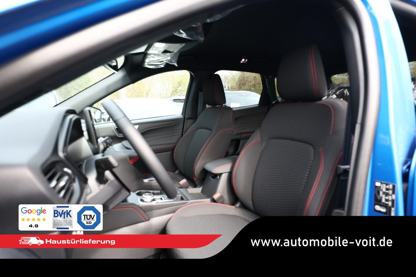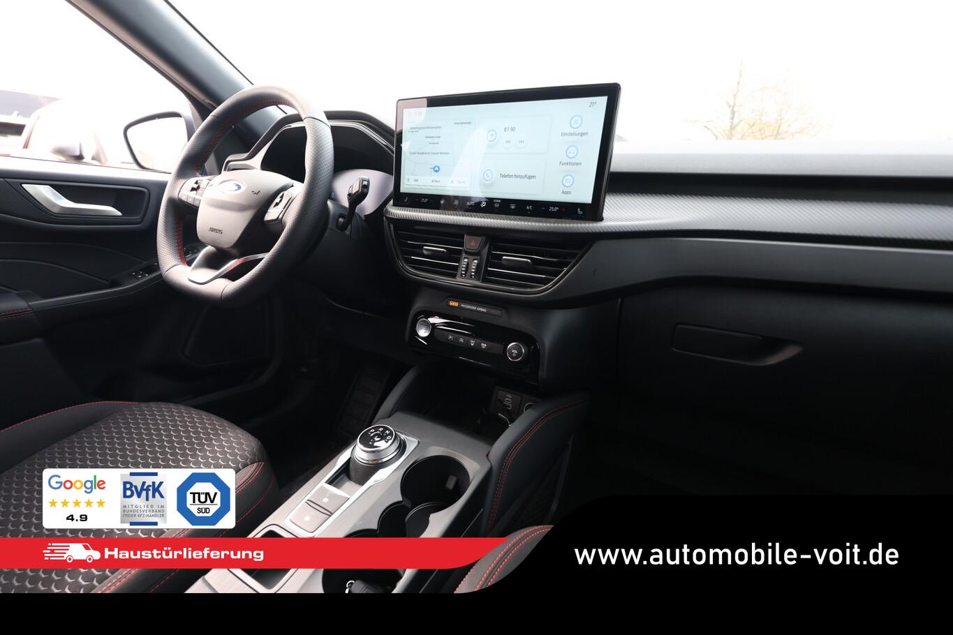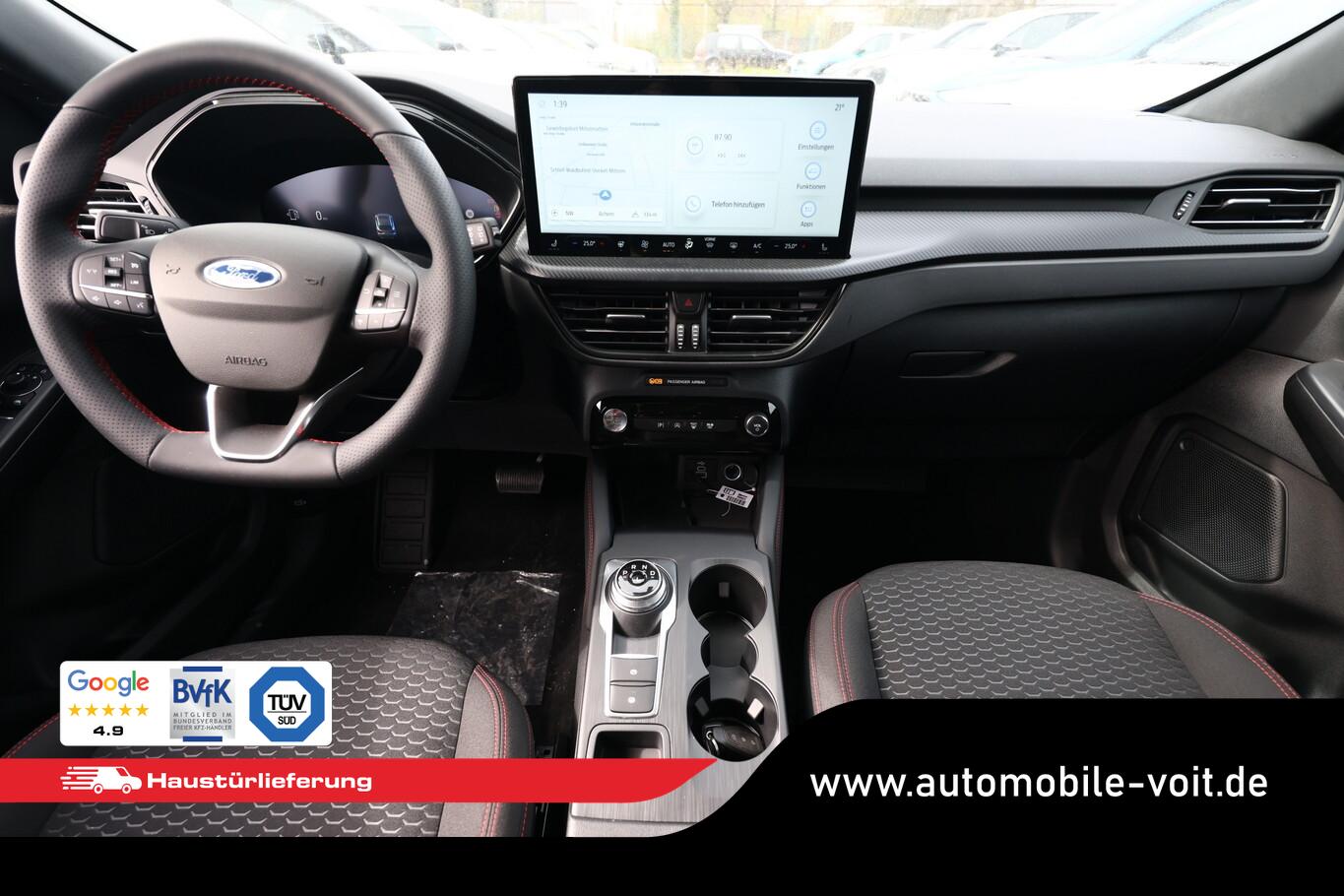 Matrix-LED-Scheinwerfer, Head-up-Display, Winter-Paket (Lenkrad heizbar / Sitzheizung hinten / Frontscheibe heizbar), Verglasung hinten abgedunkelt (Privacy Glass), Reserverad als Notrad, Wendematte Gepäckraum, 4 Verzurrösen, Ablagetaschen an Vordersitzlehnen, Beifahrerairbag deaktivierbar, Fahrassistenz-System: Falschfahrer-Warnfunktion, Fahrassistenz-System: Fernlichtassistent (Scheinwerfer mit Abblendautomatik), Fahrassistenz-System: Müdigkeitserkennungs-Sensor, Fahrassistenz-System: Verkehrsschildassistent, Handschuhfach beleuchtet, Lendenwirbelstütze Sitz vorn links, LM-Felgen 7,5x18, Parkbremse elektrisch, Reifen 225/60 R18, Sitz vorn links verstellbar (4-fach), Touchscreen-Farbdisplay 13,2 Zoll, Body-Styling-Paket (Kühlergrill schwarz / Seitenschweller Wagenfarbe / Stoßfänger Sport-Ausführung), Sitz vorn rechts verstellbar (8-fach) (Lendenwirbelstütze Sitz vorn rechts), Audio-Navigationssystem Ford mit AppLink (6 Lautsprecher / Radioempfang digital (DAB) / Ford SYNC IV mit Navigation / Sprachsteuerung und Bluetooth-Schnittstelle / USB-Anschluss / Audiobedienung am Lenkrad), Fahrassistenz-System: Pre-Collision-System (Fahrassistenz-System: Active City Stop / Fahrassistenz-System: Auffahrwarnsystem), KeyFree-System (Power KeyFree-Startfunktion), Mittelkonsole mit Armlehne (Getränkehalter vorn / Mittelarmlehne vorn mit Staufach und 12V-Anschluß), Geschwindigkeits-Regelanlage (Tempomat) (Intelligenter Geschwindigkeits-Begrenzer), Intelligent Protection System (IPS) (3-Punkt-Sicherheitsgurt hinten / Warnanlage für Sicherheitsgurte hinten / Warnanlage für Sicherheitsgurte vorn / Airbag Fahrer-/Beifahrerseite / Kopf-Schulter-Airbag vorn und hinten / Seitenairbag vorn), Ambiente-Beleuchtung vorn (LED), Dachhimmel Stoff, dunkel, Gepäckraumabdeckung / Rollo, Induktionsladeschale für mobile Endgeräte, Innenspiegel mit Abblendautomatik, Karosserie: 5-türig, Kombiinstrument Digitalanzeige 12,3 Zoll, Lenksäule (Lenkrad) höhen-/längsverstellbar, Motor 1,5 Ltr. - 137 kW EcoBoost KAT, Scheibenrahmen schwarz, Sonnenblende links mit Spiegel (beleuchtet), Sonnenblende rechts mit Spiegel (beleuchtet), Anti-Blockier-System (ABS), Antischlupfregelung (ASR), Antriebsart: Frontantrieb, Elektron. Stabilitäts-Programm (ESP), Getriebe Automatik - Typ: 8F35 (8-Stufen), Klimaautomatik 2-Zonen, Fensterheber elektrisch vorn + hinten mit Komfortschließung, Isofix-Aufnahmen für Kindersitz, Rücksitzlehne geteilt, Rücksitzlehne klappbar, Sitzheizung vorn, Zentralverriegelung mit Fernbedienung, Bordcomputer, Dachreling schwarz, Rückfahrkamera, Lenkrad (Sport/Leder, ST), Servolenkung elektrisch, Außenspiegel elektr. anklappbar, Außenspiegel elektr. verstell- und heizbar, Scheibenwischer mit Regensensor, Scheinwerfer-Assistent mit Tag-/Nachtsensor, Parkpilotsystem vorn und hinten, Fahrassistenz-System: Spurhalteassistent, Reifendruck-Kontrollsystem, Start/Stop-Anlage