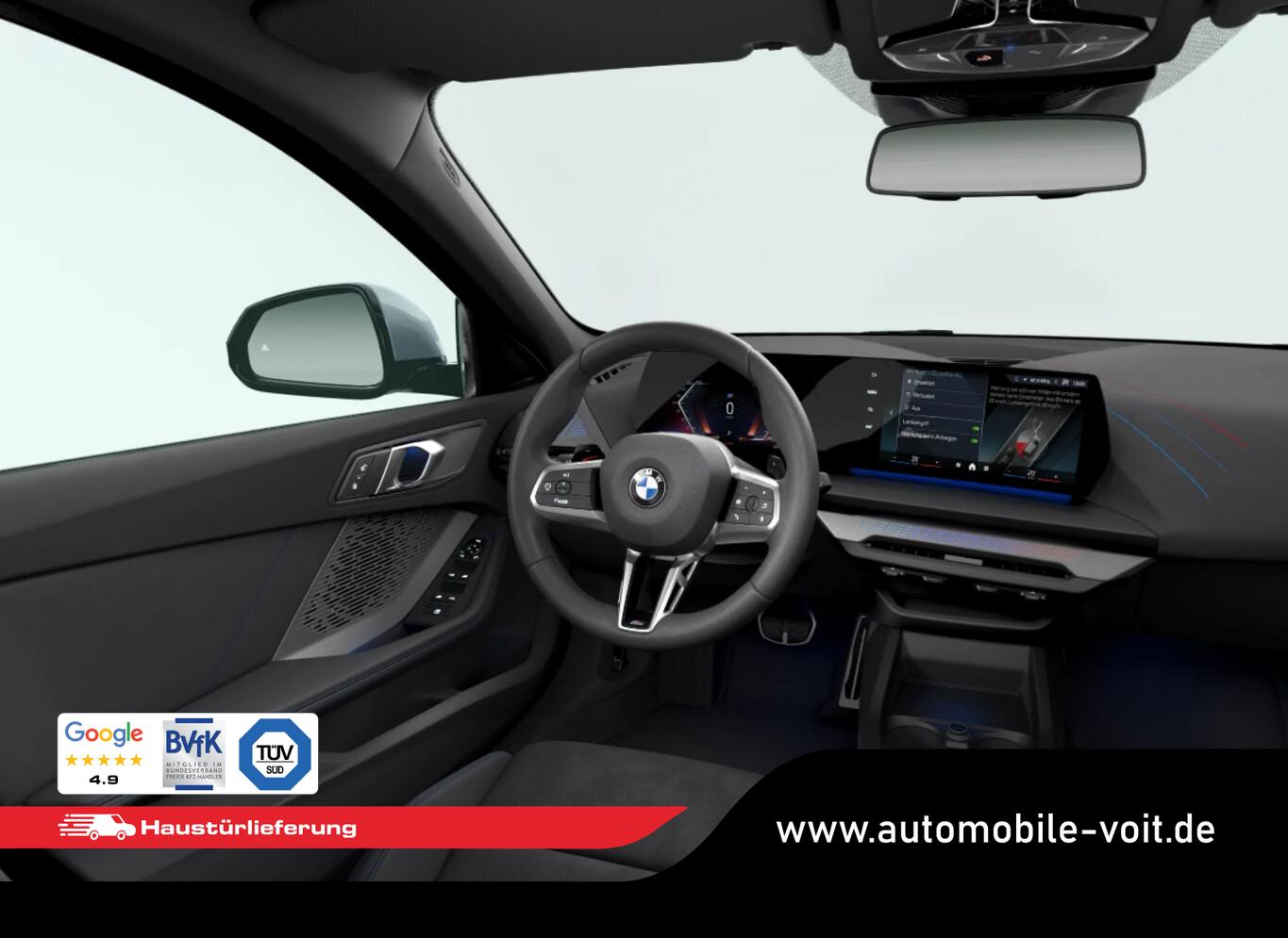Panoramadach (Glas), Sonnenschutzverglasung (hinten abgedunkelt), LM-Felgen 8x18 (Y-Speiche 975, Bicolor, Midnight Grey, glanzgedreht), Außenspiegel anklappbar, Dachzierleisten in Wagenfarbe, Einstiegsleisten Aluminiumeinleger mit Schriftzug ,,M", Fahrassistenz-System: Ausstiegswarnung, Fahrassistenz-System: Ausweichassistent, Fahrassistenz-System: Linksabbiegewarnung mit Bremsfunktion, Fahrassistenz-System: Spurverlassenswarnung mit aktiver Rückführung, Fahrassistenz-System: Verkehrszeichenerkennung, Getränkehalter vorn, Instrumententafel mit Kontrastnähten, Intelligent Personal Assistant, Interieur Lichtpaket, M Interieurdekore Illuminated Aluminium Hexacube, matt, M Kennzeichnung an den Seiten, Navigationssystem, Pedalauflagen in Edelstahloptik, Reifen 225/45 R18, Schadstoffarm nach Abgasnorm Euro 6e (EU6 EA), Motor 1,5 Ltr. - 115 kW Mild-Hybrid (Mild-Hybrid 125 kW (Motor 1,5 Ltr. - 115 kW)), Parkassistent-Paket (Fahrassistenz-System: Anhängerassistent / Fahrassistenz-System: Parken Anfahrüberwachung / Fahrassistenz-System: Rückfahr-Assistent / Fahrassistenz-System: Rückfahrhilfe Notbremsfunktion (Active PDC) / Rückfahrkamera / Fahrassistenz-System: Park-Assistent), Fahrassistenz-System: Driving Assistant (Fahrassistenz-System: Heckaufprall-Vermeidung (Prävention Heckkollision) / Fahrassistenz-System: Querverkehrs-Assistent / Fahrassistenz-System: Spurwechsel-Warnsystem), Aktive Motorhaube, Außenausstattung: Shadow-Line Hochglanz, BMW Live Cockpit Plus, Dachhimmel Anthrazit, Geschwindigkeits-Begrenzeranlage (Speed Limit Device), Karosserie: 5-türig, M Sport, Parkbremse elektrisch, Personalisierungssystem (BMW My Modes), Personalisierungssystem (Personal eSIM), Radioempfang digital (DAB+), Service-System: Gesetzlicher Notruf, Sitzbezug / Polsterung: M Alcantara / Veganza Kombination (Schwarz mit blau Kontraststeppung), Multimedia-Schnittstelle 2 x USB (Typ C) Mittelkonsole vorn, Anti-Blockier-System (ABS), Bremsassistent, Fahrassistenz-System: Active Guard (Bremsassistent), Adaptives Fahrwerk M-Technic, Getriebe 7-Gang - Doppelkupplungsgetriebe mit Steptronic und Schaltwippen, Klimaautomatik, Airbag Beifahrerseite abschaltbar, Airbag Fahrer-/Beifahrerseite, Armauflage vorn, Fensterheber elektrisch, Isofix-Aufnahmen für Kindersitz an Beifahrersitz, Isofix-Aufnahmen für Kindersitz an Rücksitz, Sitzheizung vorn, Sportsitze vorn, Zentralverriegelung mit Fernbedienung, Geschwindigkeits-Regelanlage mit Bremsfunktion, Service-System: Intelligenter Notruf inkl. TeleServices, Lenkrad (Leder) mit Multifunktion M-Technic, Servolenkung Servotronic, Licht- und Regensensor, Lichtassistent (Follow me home), Scheinwerfer LED, Fahrassistenz-System: Aufmerksamkeits-Assistent, Fahrassistenz-System: Performance Control, Reifendruck-Kontrollsystem