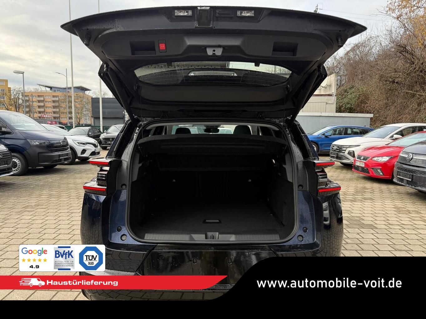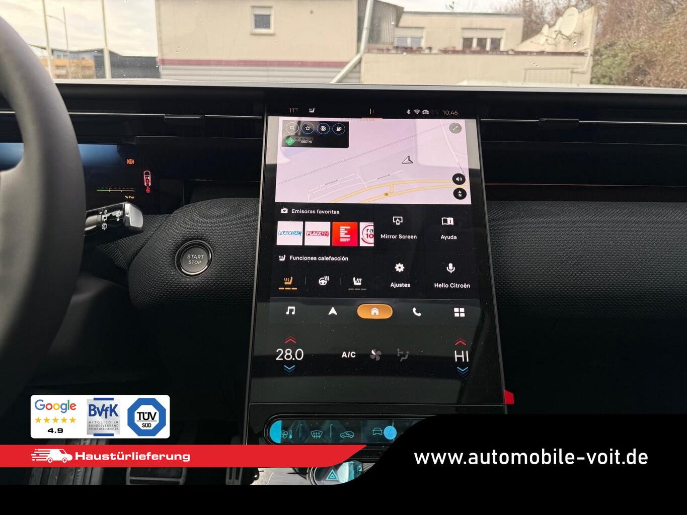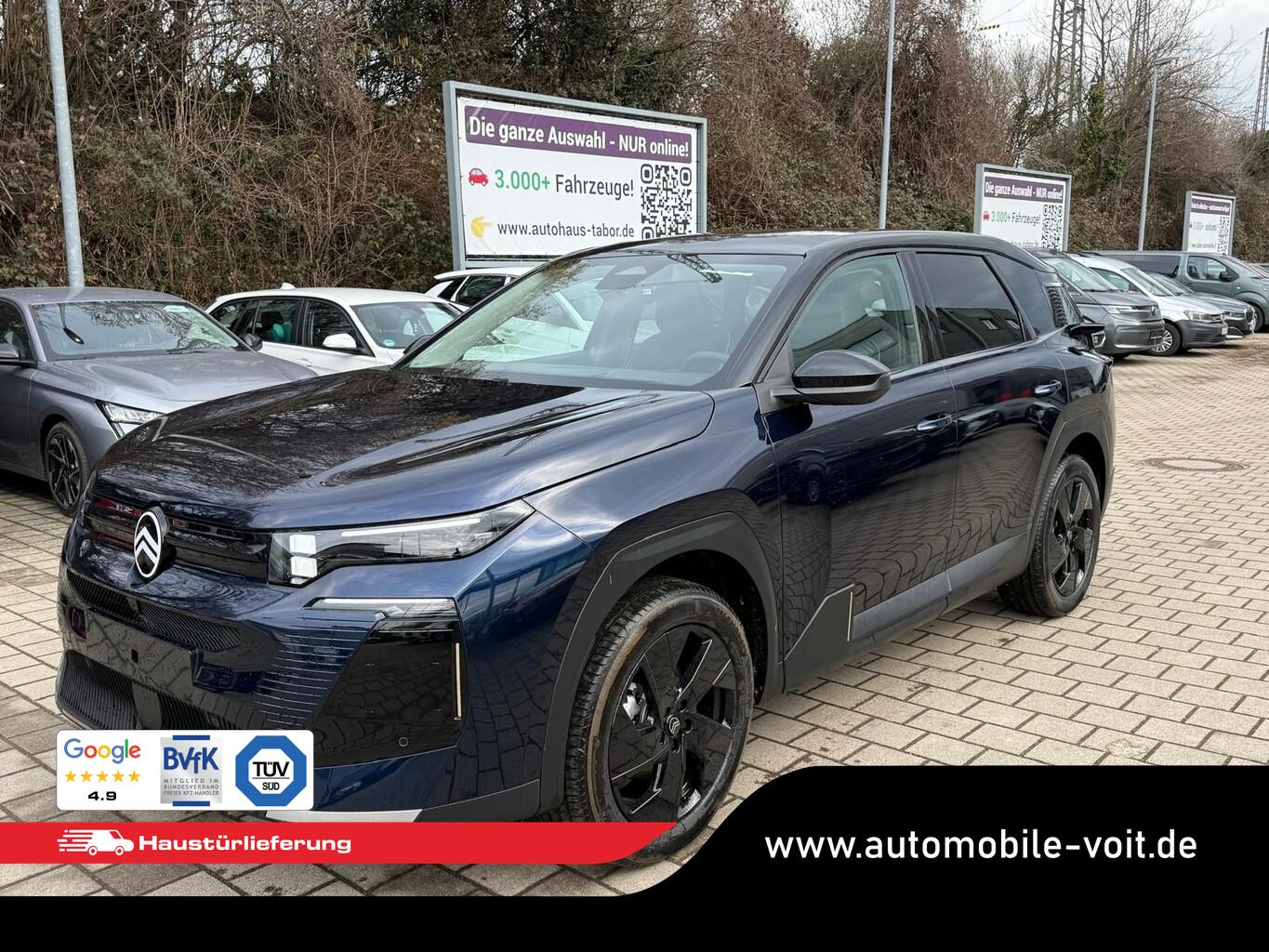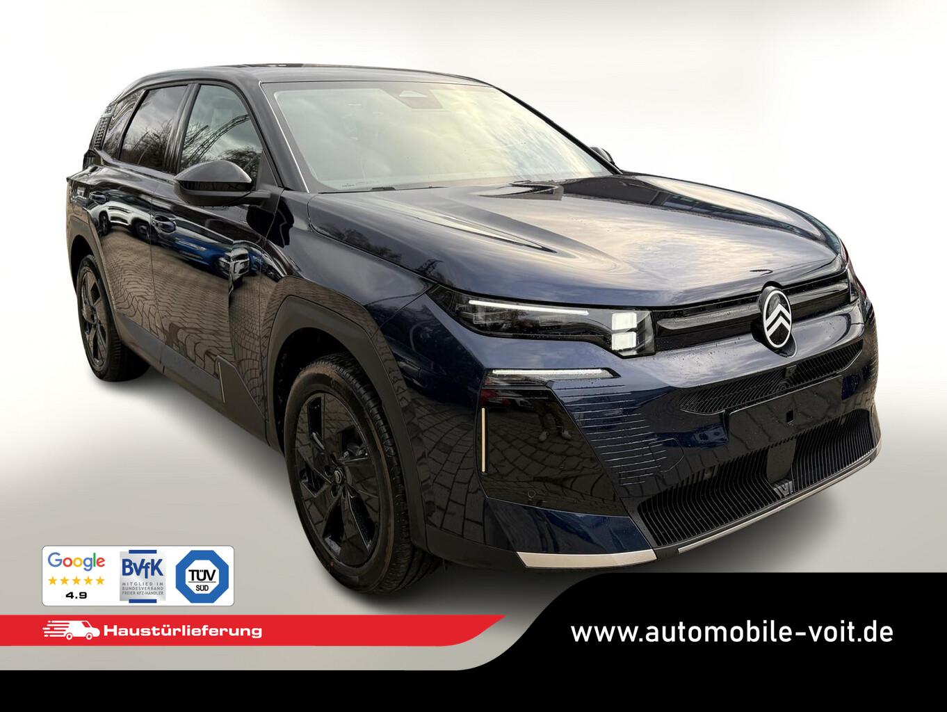 Panorama-Schiebedach (Innenspiegel rahmenlos mit Abblendautomatik), Dachfarbe Perla-Nera-Schwarz, Reifen-Reparaturkit, 2-Zonen-Klimaautomatik, 4 Verzurrösen, Ablagetaschen an Vordersitzlehnen, Airbag Fahrer-/Beifahrerseite, Anschlussgarantie 1 Jahr, Beifahrerairbag deaktivierbar, Bluetooth-Schnittstelle, Bordcomputer, Dekoreinlage Blau, Einschaltautomatik für Fahrlicht, Elektr. Servolenkung, Fahrassistenz-System: Fernlichtassistent, Fahrassistenz-System: Halbautomatischer Spurwechselassistent, Fahrassistenz-System: Rückfahr-Notbremsassistent (Rear Cross Traffic Alert), Fahrassistenz-System: Spurhalteassistent, Fahrassistenz-System: Spurpositionierungsassistent, Fahrassistenz-System: Totwinkel-Assistent, Freisprecheinrichtung Bluetooth, Frontscheibe schallgedämmt, Fußraumbeleuchtung LED, Isofix-Halterungen hinten, Kopf-Airbag-System, Lendenwirbelstütze Sitz vorn links elektr. verstellbar, LM-Felgen 19 Zoll, Radioempfang digital (DAB), Reifen 225/55 R19, Reifendrucküberwachungssensor, Schadstoffarm nach Abgasnorm Euro 6e (EU6 EA), Scheinwerfer Matrix-LED, Seitenairbag vorn, Sitze vorn einstellbar, links elektr. 8-fach mit Memory-Funktion, rechts manuell 6-fach, Sitzheizung vorn, Smartphone-Schnittstelle (Apple CarPlay & Android Auto), USB-Schnittstelle (Typ C), Vorrüstung Anhängerkupplung, Ambiente-Beleuchtung LED, Audio-Navigationssystem: Citroen Connect Nav (Touchscreen 13"), Außenausstattung: Farbclips in Gold Satin, Außenspiegel mit Einparkfunktion/Rückwärtsparkhilfe, Induktionsladeschale für Smartphone (Wireless Charging), Innenausstattung: Ambiente Hype Blue, Karosserie: 5-türig, Koffer-/Laderaumboden variabel (Moduboard), Kombiinstrument digital (10,0 Zoll), Lenksäule (Lenkrad) mech. höhen-/längsverstellbar, Luftqualitäts-Überwachungssystem und Luftfiltersystem (Clear Cabin), Mild-Hybrid 107 kW (Motor 1,2 Ltr. - 100 kW), Parkbremse elektrisch, Pedale Aluminium, Rücksitz mit Armlehne, Sonnenblenden mit Spiegel (beleuchtet), Antriebsart: Frontantrieb, Getriebe Automatik - Doppelkupplungsgetriebe (6-Stufen, Hybrid), Fensterheber elektr. hinten mit Impulsgeber, Fensterheber elektr. vorn mit Impulsgeber, Mittelarmlehne vorn, Rücksitzlehne geteilt/klappbar, Seitenscheiben hinten und Heckscheibe dunkel getönt, Zentralverriegelung / Startanlage Keyless System, Head-up-Display, Kofferraumdeckel / Heckklappe elektr. betätigt (öffnen + schliessen, sensorgesteuert), Adaptive Geschwindigkeitsregelanlage (ACC) inkl. Stop&Go und Geschwindigkeits-Begrenzeranlage, Lenkrad mit Multifunktion, Außenspiegel elektr. verstell-, heiz- und anklappbar, Heckleuchten LED, Scheibenwischer mit Regensensor, Tagfahrlicht LED, Einparkhilfe vorn und hinten inkl. Visio Park Rückfahrkamera mit 360° Umgebungsansicht, Start-Stop-Knopf