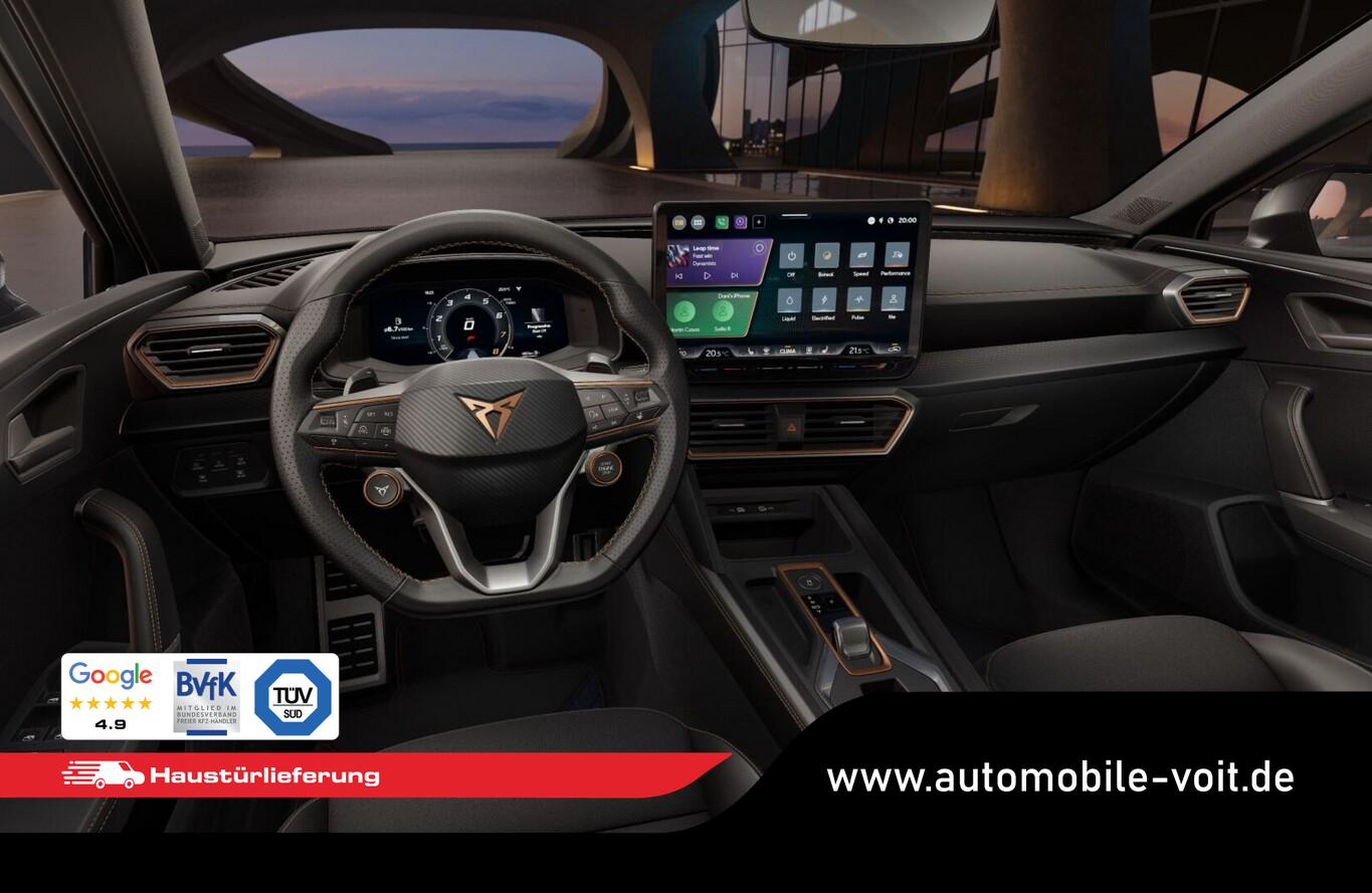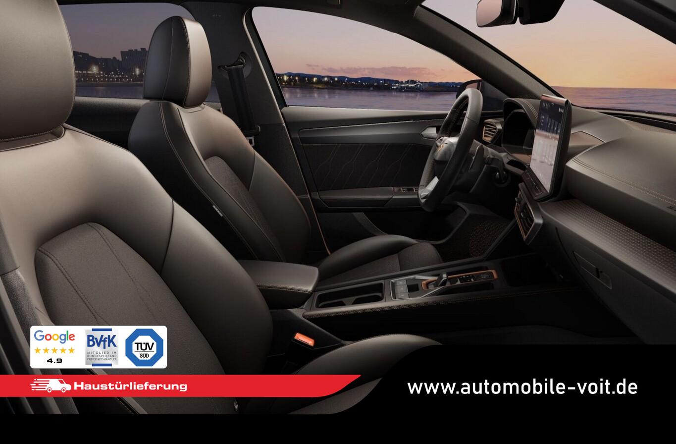Edge-Paket (Ambiente-Beleuchtung LED / Ambiente-Beleuchtung Smart Ambient Light / Schließ-/Startsystem Kessy Advanced / Rückfahrkamera / Diebstahl-Warnanlage mit Innenraumüberwachung und Abschleppschutz), Winter-Paket (Sitzheizung vorn), Reserverad als Notrad, Ablagetaschen an Rückseite der Vordersitzlehnen, Antiblockiersystem (ABS), Bluetooth-Schnittstelle, Elektron. Stabilitäts-Programm (ESP), Fahrassistenz-System: Abbiegebremsfunktion und Ausweichunterstützung, Fahrassistenz-System: Kreuzungs-Assistent (Crossroad Assist), Freisprecheinrichtung Bluetooth, Gepäckraumabdeckung, Geschwindigkeitsbegrenzer, Induktionsladeschale für Smartphone, Isofix-Aufnahmen für Kindersitz an Beifahrersitz und Rücksitz, Knieairbag Fahrer-/Beifahrerseite, LM-Felgen 7,5x18 (Garbi), Mittelarmlehne hinten, Navigation in Verbindung mit dem Smartphone (über Apple Carplay / Android Auto /...), Ottopartikelfilter (OPF), Pedale Aluminium-Design, Rücksitzlehne geteilt/klappbar, Seitenairbag hinten, Serviceintervall 30000 km oder 2 Jahre, Sitz vorn links höhenverstellbar, Sommerreifen 225/40 R18, Sprachsteuerungs-System, Start-Stopp-System, Tagfahrlicht LED, Vorbereitung Navigationssystem, Waschwasserstandsanzeige, Licht- und Sicht-Paket (Innenspiegel mit Abblendautomatik / Einschaltautomatik für Fahrlicht / Licht- und Regensensor / Lichtassistent (Coming Home, Leaving Home)), Media-System Plus (Audiosystem mit 12,9" Touchscreen-Farbdisplay), Voll-LED-Paket (Leuchtweitenregelung automatisch / Heckleuchten Voll-LED mit dynamischem Lichtband (Infinite Light) / Nebelscheinwerfer LED mit Abbiegelicht / Scheinwerfer Voll-LED), 6 Lautsprecher, Einstiegsleisten vorn beleuchtet, Gepäck-/Laderaumboden doppelt, Karosserie: 5-türig, Kombiinstrument digital (virtual cockpit), Kopfstützen hinten (3-fach), Lendenwirbelstütze Sitz vorn links, verstellbar, Lendenwirbelstütze Sitz vorn rechts, verstellbar, Leseleuchten hinten LED, Leseleuchten vorn LED, Mild-Hybrid 110 kW (Motor 1,5 Ltr. - 110 kW eTSI), Parkbremse elektrisch mit Auto-Hold-Funktion, Radioempfang digital (DAB+), Sitz vorn rechts höhenverstellbar, Sitzbezug / Polsterung: Stoff/Kunstleder schwarz (Sharp Textil), Sonnenblende links mit Spiegel (beleuchtet), Sonnenblende rechts mit Spiegel (beleuchtet), Steckdose 230V im Gepäckraum, Warnanlage für Sicherheitsgurt-System, Full Link (MirrorLink, Apple CarPlay und Android Auto), USB-Ladeanschlüsse (2-fach, Typ C) für 2.Sitzreihe, USB-Schnittstelle vorn (2-fach, Typ C), Antriebsart: Frontantrieb, Elektron. Differentialsperre (XDS), Getriebe 7-Gang - Doppelkupplungsgetriebe DSG, Klimaanlage Climatronic 3-Zonen, Airbag Beifahrerseite abschaltbar, Airbag Fahrer-/Beifahrerseite, Fensterheber elektrisch vorn + hinten mit Komfortschaltung, Kopf-Airbag-System, Mittelarmlehne vorn, Seitenairbag, Seitenairbag vorn mitte (Central Airbag), Seitenscheiben ab 2.Sitzreihe und Heckscheibe dunkel getönt (Privacy Glass), Fahrassistenz-System: Fahrprofilauswahl (CUPRA Drive Profile), Fahrassistenz-System: Automatische Distanzregelung (ACC), Fahrassistenz-System: Verkehrszeichenerkennung, Notrufsystem, Lenkrad heizbar (CUPRA Supersport, Leder) mit Multifunktion und Schaltfunktion, Progressivlenkung, Außenspiegel elektr. verstell-, heiz- und anklappbar mit Spiegelabsenkung und Welcome Light, Fahrassistenz-System: Fernlichtassistent, Einparkhilfe vorn und hinten, Fahrassistenz-System: Müdigkeitserkennung, Fahrassistenz-System: Spurhalteassistent, Fahrassistenz-System: Umfeldbeobachtungssystem (Front assist) mit City-Notbremsfunktion, Reifenkontroll-Anzeige