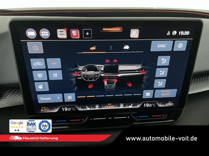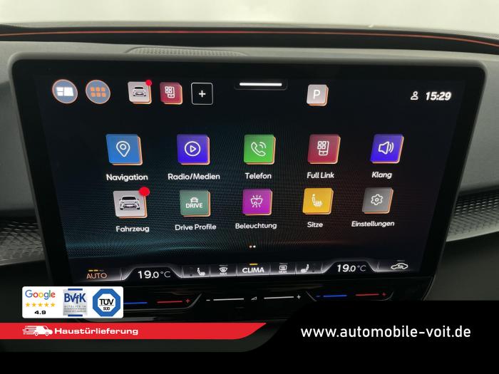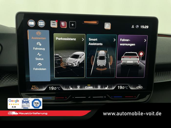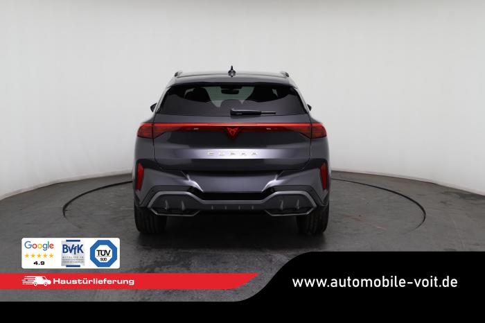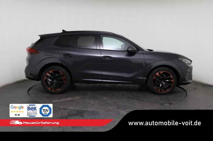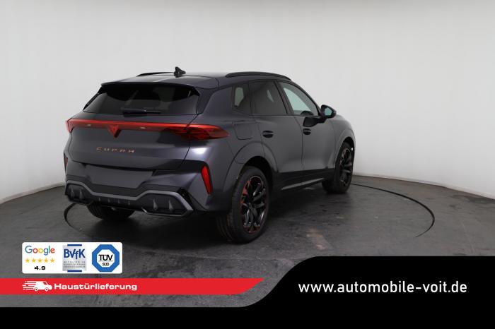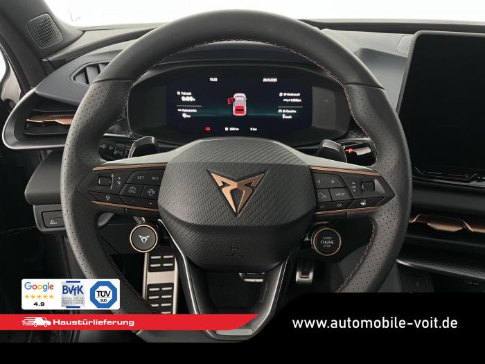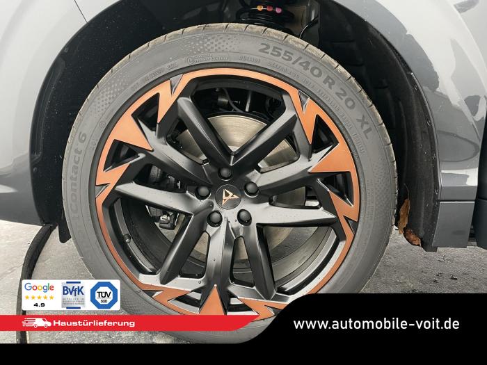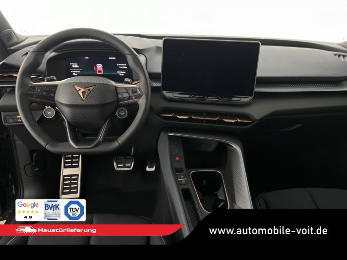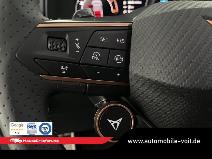 2 USB-C-Schnittstellen vorn und 2 USB-C-Ladebuchsen für die 2. Sitzreihe, 9 Lautsprecher, Connectivity Box mit Wireless Charger, Digitaler Radioempfang DAB , Full Link Wireless für Andorid Auto und Apple CarPlay, Media System Plus mit 12,9 Farb-Touch-Screen, Navigationssystem, Sprachsteuerung, 3D LED-Heckleuchten mit dynamischen Blinkleuchten und bleuchtetem CUPRA Logo, HD-Matrix-Scheinwerfer mit Projektionsfunktion und Welcome Ceremony, LED-Nebelscheinwerfer mit Abbiegelicht-Funktion, Smart Ambiente Light, Tagfahrlicht in LED-Technologie, Türeinstiegsleisten beleuchtet, vorne, Welcome Light, Fensterheber vorn und hinten elektrisch, mit Einklemmschutz und One-Touch-Funktion, Seitenscheiben ab 2. Sitzreihe und Heckscheibe dunkel getönt, Dachhimmel in Schwarz, Innenspiegel automatisch abblendend, Lenkrad beheizbar, Mittelarmlehne hinten, Mittelarmlehne vorn, Multifunktionslenkrad in Leder mit Schaltwippen, Sportpedalerie in Aluminiumoptik, Variabler Gepäckraumboden, Klimaanlage Climatronic mit 3-Zonen-Temperaturregelung, Digital Drive Paket, Edge Paket, 20 Leichtmetallräder Vortex Copper, glanzgedreht [Z0C] , Performance-Reifen 255/40 R20, Airbag für Fahrer und Beifahrer, mit Beifahrerairbag-Deaktivierung, Diebstahl-Warnanlage inkl. Innenraumüberwachung, Back-up-Horn und Abschleppschutz, Elektronisches Stabilisierungsprogramm und elektromechanischer Bremskraftverstärker, ISOFIX-Kindersitz-Sicherungssystem für den Beifahrersitz und in der 2. Sitzreihe links und rechts inkl. Top Thether Verankerungspunkte, Kopfairbag-System vorn und hinten, Seitenairbags vorn, Center Airbag, Notruf-Service, Wegfahrsperre, elektronisch, Lendenwirbelstütze für Fahrer und Beifahrer, Rücksitzlehne asymmetrisch geteilt umklappbar, Sportsitze vorn, Vordersitze beheizbar, Vordersitze mit Höheneinstellung, Anschlussgarantie 3 Jahre/ 100.000 km, CUPRA CONNECT Plus (3 Jahre), Ablenkungs- und Müdigkeitserkennung, Automatische Distanzregelung ACC, Berganfahrassistent, CUPRA Drive Profile, Einparkhilfe vorne und hinten, Elektronische Parkbremse inkl. Auto-Hold-Funktion, Head-up Display, Kreuzungsassistent, Notbremsassistent Front Assist mit Fußgänger- und Radfahrererkennung, Progressivlenkung, Rückfahrkamera, Schlüsselloses Schließ- und Startsystem Kessy, Spurhalteassistent, Umstellung Infotainment / Bordcomputer auf DE, Verkehrszeichenerkennung, Volldigitales Kombiinstrument mit 10,25 TFT Display, Adaptive Fahrwerksregelung DCC, Anhängevorrichtung, schwenkbar mit elektrischer Entriegelung, Außenspiegel elektrisch einstell-, anklapp- und beheizbar mit Memory-Funktion, Dachreling in Schwarz, Heckklappe elektrisch betätigt (Öffnung & Schließung) inkl. Sensorgesteuerter Öffnung & Schließung (Virtual Pedal), EU-Fahrzeug mit Tageszulassung