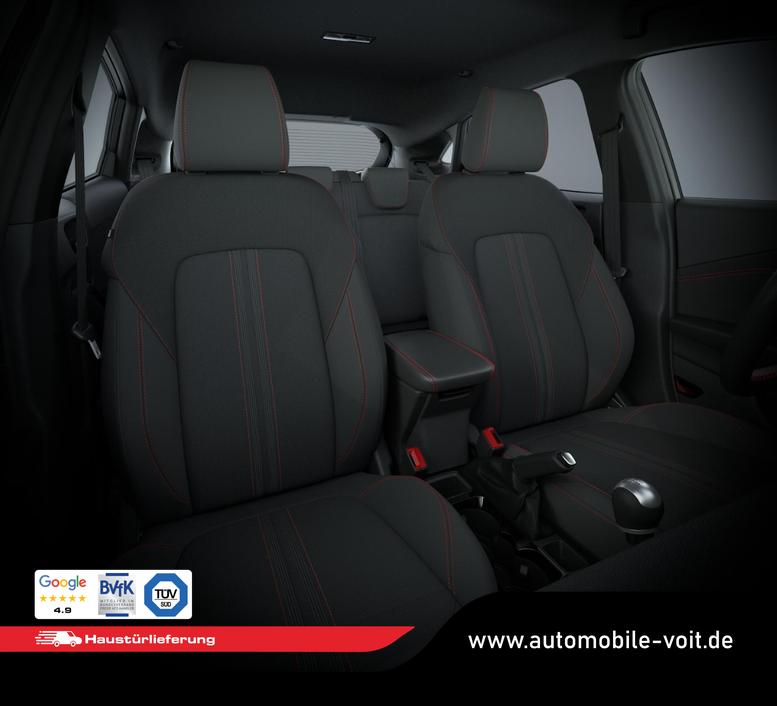 • Schwarzer Stoffbezug mit roter Naht