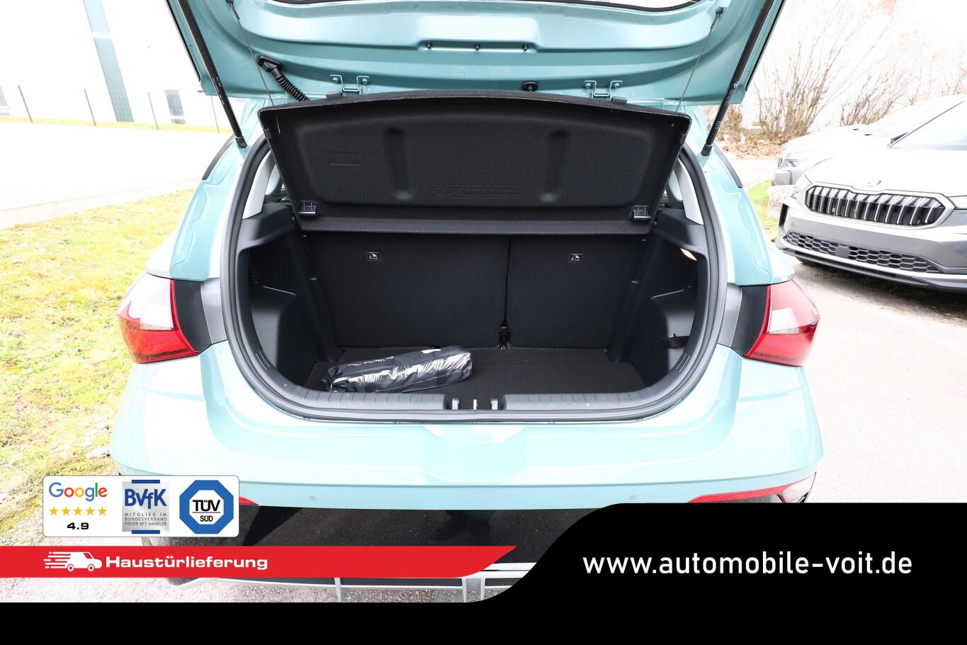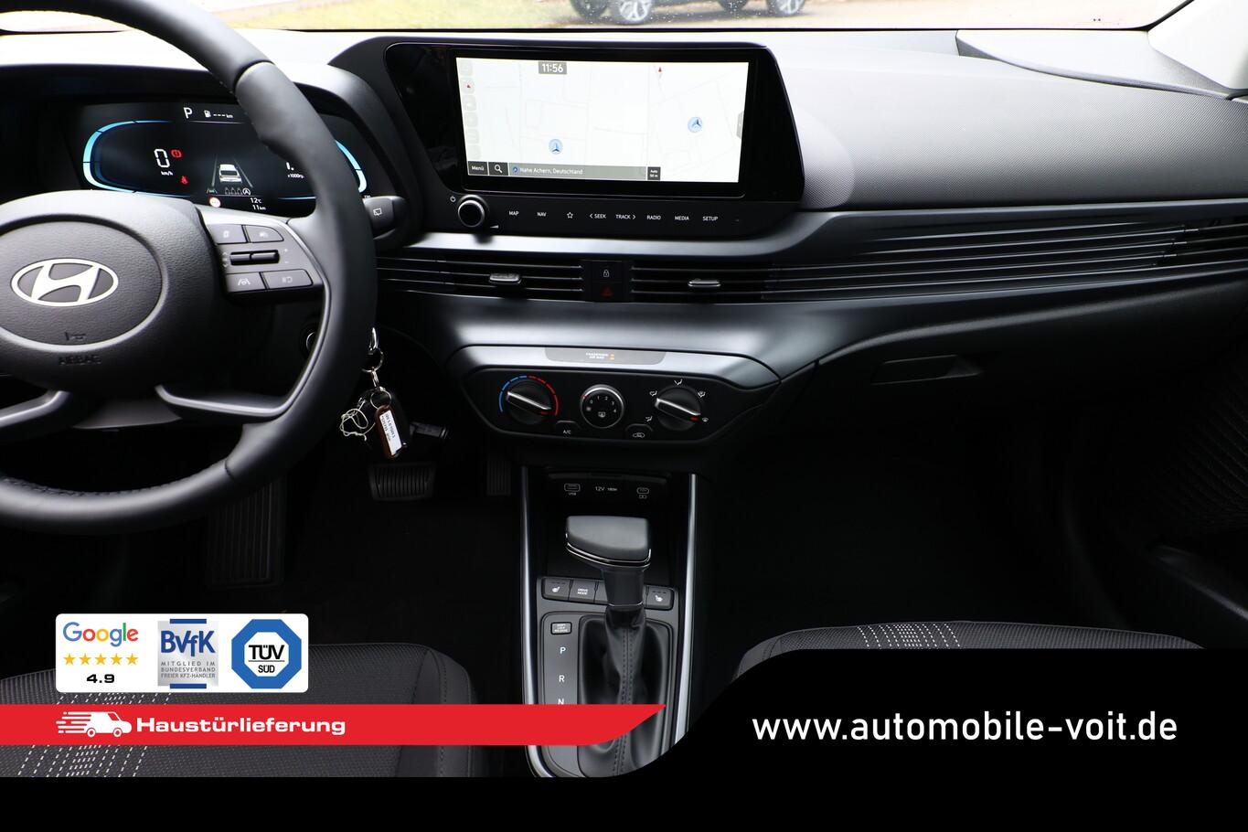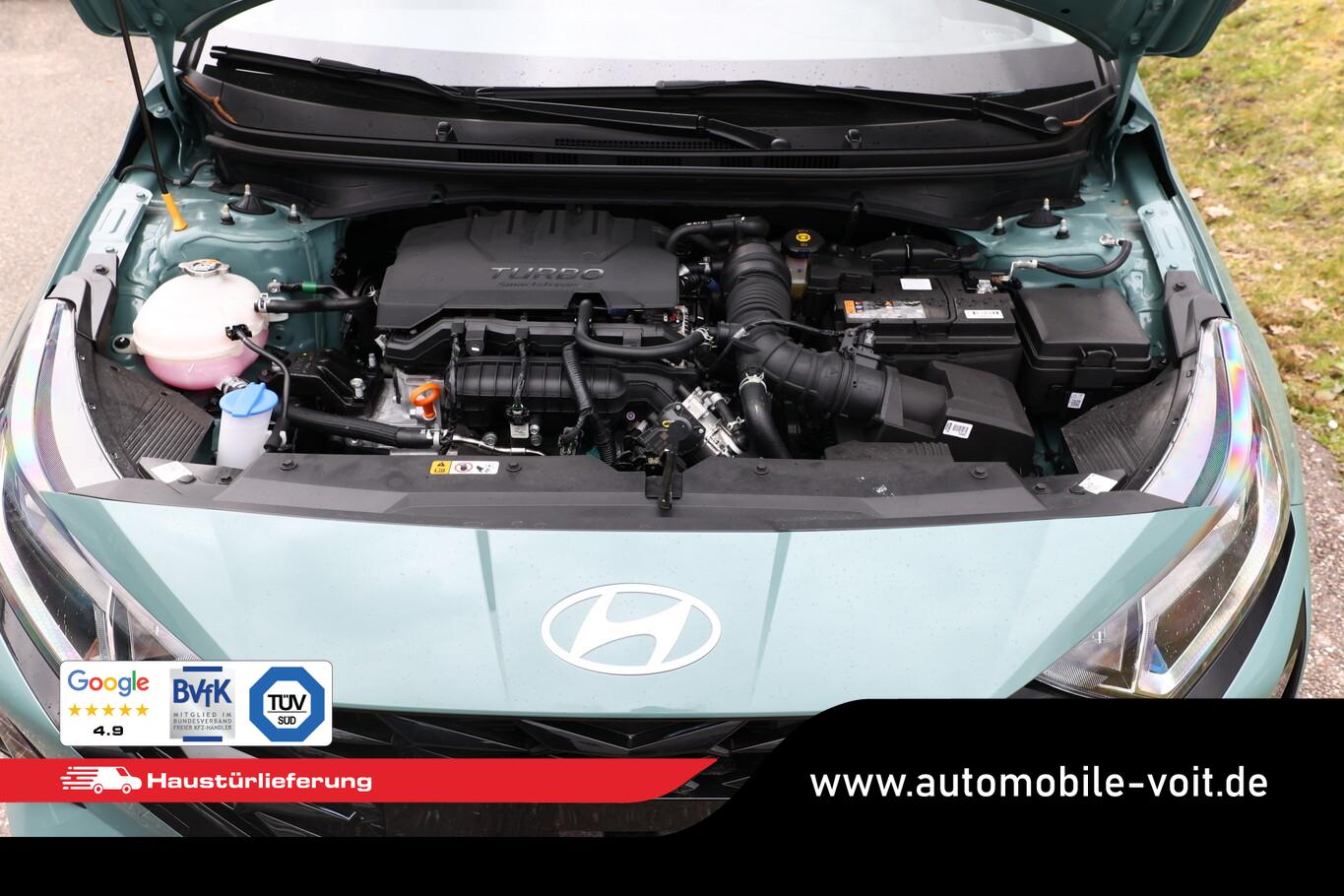 Beifahrersitz mit Tasche an Rückseite, Ersatzrad, Innenspiegel abblendbar, Isofix-Aufnahmen für Kindersitz, Kopfstützen vorn verstellbar, LM-Felgen 16 Zoll, Reifen 195/55 R16, Schadstoffarm nach Abgasnorm Euro 6e (EU6 EA), SmartLink (Apple CarPlay und Android Auto), Lenkrad (4-Speichen) (Lenkrad (Leder)), Audio-Navigationssystem (Touchscreen-Farbdisplay (10,25 Zoll)), Service-System: Remote Services (Blue Link) (Service-System: Online Update OTA (Over The Air)), Fahrassistenz-System: Autonome Notbremsfunktion inkl. Frontkollisionswarnung (FCA) (Fahrassistenz-System: Autonome Notbremsfunktion inkl. Fahrradfahrererkennung (FCA-Cyc.) / Fahrassistenz-System: Autonome Notbremsfunktion inkl. Fußgängererkennung (FCA-Ped.)), Außenspiegel lackiert, Fahrassistenz-System: Insassenalarm (ROA), Fahrassistenz-System: Multikollisionsbremse (Multi Collision Brake), Heckscheibe heizbar, Karosserie: 5-türig, Kopfstützen hinten verstellbar, Lenkrad heizbar, Lenksäule (Lenkrad) höhenverstellbar, Lenksäule (Lenkrad) längsverstellbar, Motor 1,0 Ltr. - 74 kW TGDI KAT, Otto-Partikelfilter (OPF), Radioempfang digital (DAB+), Schalt-/Wählhebelgriff Leder, Sitz vorn links höhenverstellbar, Sitzbezug / Polsterung: Stoff, Steckdose (12V-Anschluß) vorn, Türgriffe außen Wagenfarbe, Freisprecheinrichtung Bluetooth, USB-Anschluss (Typ C), USB-Anschluss hinten, USB-Anschluss Mittelkonsole, Anti-Blockier-System (ABS), Elektron. Stabilitätskontrolle (ESC) mit Bremsassistent, Wegfahrsperre (elektronisch), Getriebe 7-Gang - Doppelkupplungsgetriebe DCT, Klimaanlage, Airbag Beifahrerseite, Airbag Beifahrerseite abschaltbar, Airbag Fahrerseite, Fensterheber elektrisch hinten, Fensterheber elektrisch vorn, Kopf-Airbag-System, Mittelarmlehne vorn verschiebbar, Rücksitzlehne geteilt/klappbar, Seitenairbag vorn, Sitzheizung vorn, Zentralverriegelung mit Fernbedienung, Fahrassistenz-System: Berganfahrhilfe, Fahrassistenz-System: Verkehrszeichenerkennung, erweitert (Geschwindigkeits-Regel-/Begrenzeranlage), Geschwindigkeits-Regelanlage (Tempomat), Rückfahrkamera, Fahrassistenz-System: Sicherheitssystem mit automatischem Notruf (ERA GLONASS / eCall), Lenkrad (Leder) mit Multifunktion, Servolenkung, Außenspiegel elektr. verstell- und heizbar, beide, Einschaltautomatik für Fahrlicht / Lichtsensor, Tagfahrlicht LED, Einparkhilfe hinten, Fahrassistenz-System: aktiver Spurhalteassistent (LKAS, Lane Keep Assist System), Reifendruck-Kontrollsystem, Alarmanlage, Start/Stop-Anlage