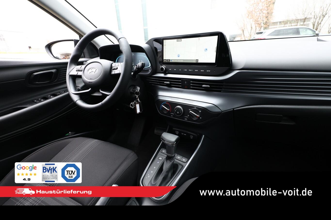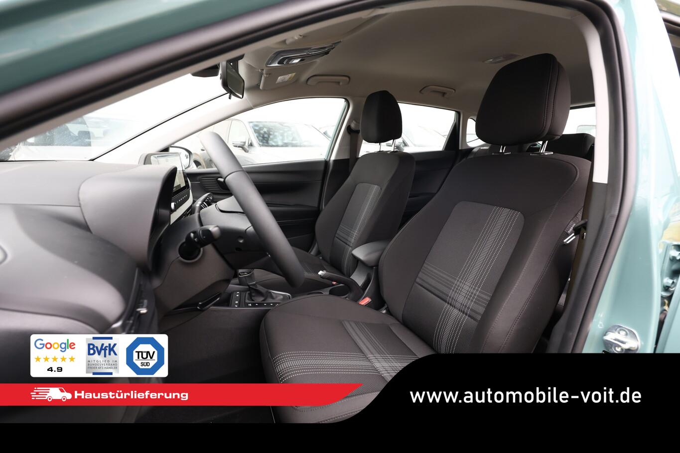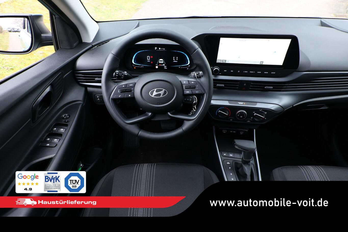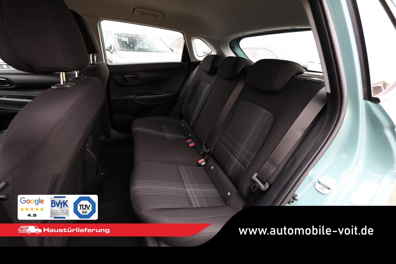 Beifahrersitz mit Tasche an Rückseite, Ersatzrad, Innenspiegel abblendbar, Isofix-Aufnahmen für Kindersitz, Kopfstützen vorn verstellbar, LM-Felgen 16 Zoll, Reifen 195/55 R16, Schadstoffarm nach Abgasnorm Euro 6e (EU6 EA), SmartLink (Apple CarPlay und Android Auto), Lenkrad (4-Speichen) (Lenkrad (Leder)), Audio-Navigationssystem (Touchscreen-Farbdisplay (10,25 Zoll)), Service-System: Remote Services (Blue Link) (Service-System: Online Update OTA (Over The Air)), Fahrassistenz-System: Autonome Notbremsfunktion inkl. Frontkollisionswarnung (FCA) (Fahrassistenz-System: Autonome Notbremsfunktion inkl. Fahrradfahrererkennung (FCA-Cyc.) / Fahrassistenz-System: Autonome Notbremsfunktion inkl. Fußgängererkennung (FCA-Ped.)), Außenspiegel lackiert, Fahrassistenz-System: Insassenalarm (ROA), Fahrassistenz-System: Multikollisionsbremse (Multi Collision Brake), Heckscheibe heizbar, Karosserie: 5-türig, Kopfstützen hinten verstellbar, Lenkrad heizbar, Lenksäule (Lenkrad) höhenverstellbar, Lenksäule (Lenkrad) längsverstellbar, Motor 1,0 Ltr. - 74 kW TGDI KAT, Otto-Partikelfilter (OPF), Radioempfang digital (DAB+), Schalt-/Wählhebelgriff Leder, Sitz vorn links höhenverstellbar, Sitzbezug / Polsterung: Stoff, Steckdose (12V-Anschluß) vorn, Türgriffe außen Wagenfarbe, Freisprecheinrichtung Bluetooth, USB-Anschluss (Typ C), USB-Anschluss hinten, USB-Anschluss Mittelkonsole, Anti-Blockier-System (ABS), Elektron. Stabilitätskontrolle (ESC) mit Bremsassistent, Wegfahrsperre (elektronisch), Getriebe 7-Gang - Doppelkupplungsgetriebe DCT, Klimaanlage, Airbag Beifahrerseite, Airbag Beifahrerseite abschaltbar, Airbag Fahrerseite, Fensterheber elektrisch hinten, Fensterheber elektrisch vorn, Kopf-Airbag-System, Mittelarmlehne vorn verschiebbar, Rücksitzlehne geteilt/klappbar, Seitenairbag vorn, Sitzheizung vorn, Zentralverriegelung mit Fernbedienung, Fahrassistenz-System: Berganfahrhilfe, Fahrassistenz-System: Verkehrszeichenerkennung, erweitert (Geschwindigkeits-Regel-/Begrenzeranlage), Geschwindigkeits-Regelanlage (Tempomat), Rückfahrkamera, Fahrassistenz-System: Sicherheitssystem mit automatischem Notruf (ERA GLONASS / eCall), Lenkrad (Leder) mit Multifunktion, Servolenkung, Außenspiegel elektr. verstell- und heizbar, beide, Einschaltautomatik für Fahrlicht / Lichtsensor, Tagfahrlicht LED, Einparkhilfe hinten, Fahrassistenz-System: aktiver Spurhalteassistent (LKAS, Lane Keep Assist System), Reifendruck-Kontrollsystem, Alarmanlage, Start/Stop-Anlage