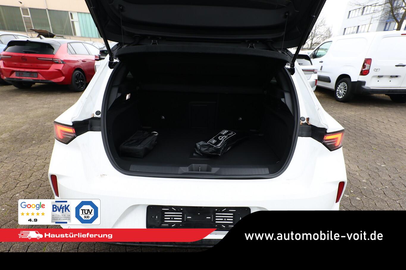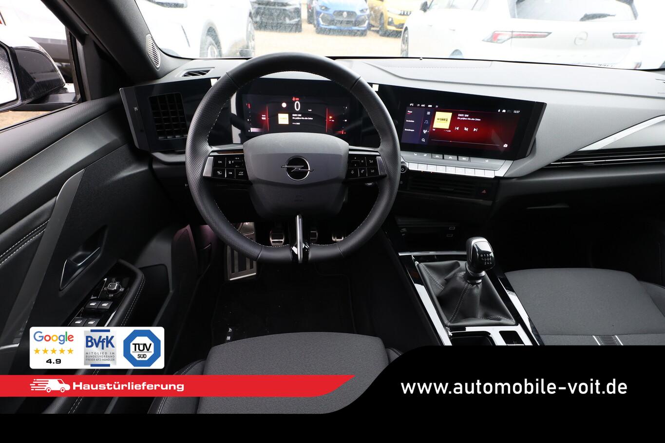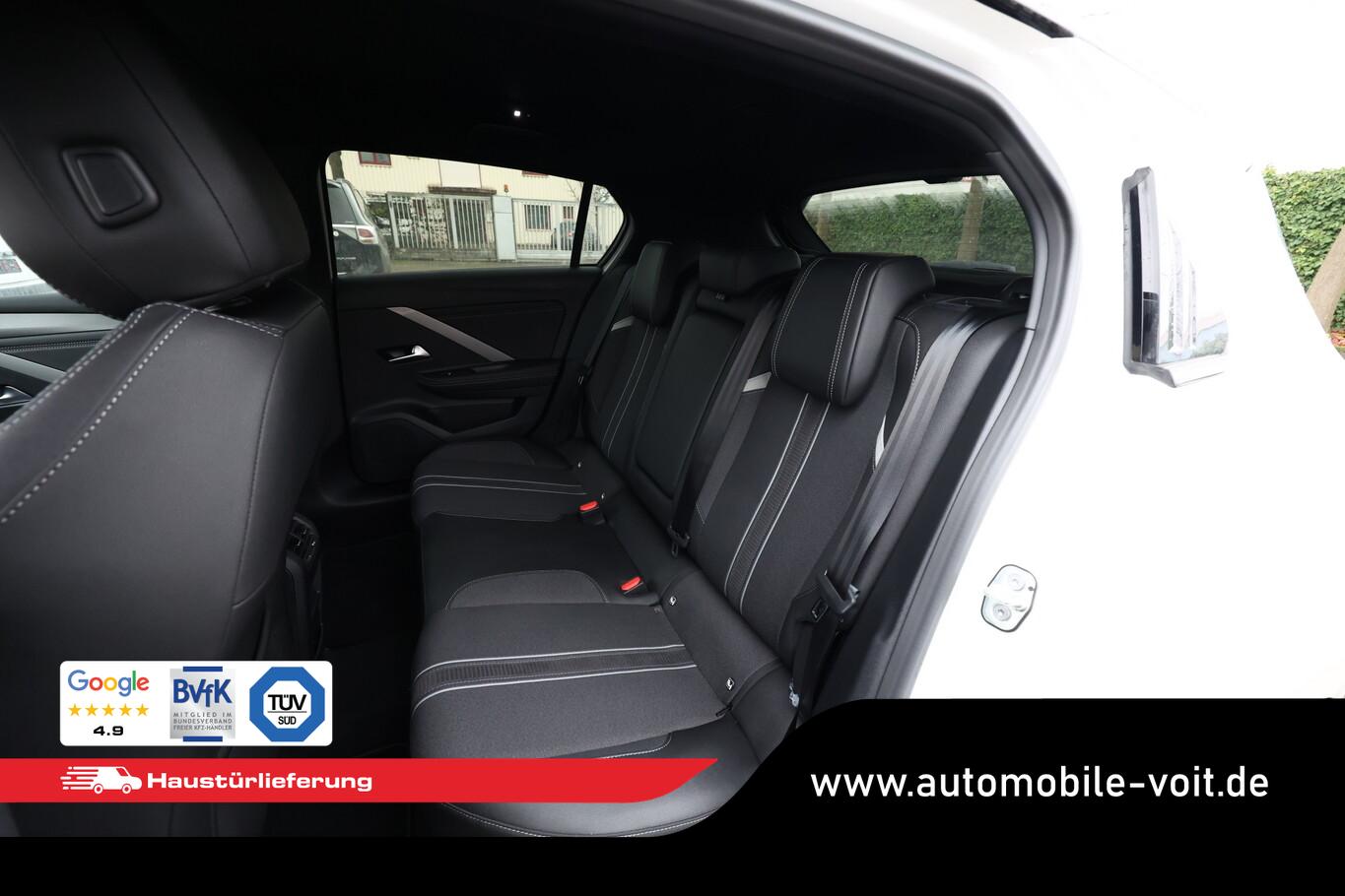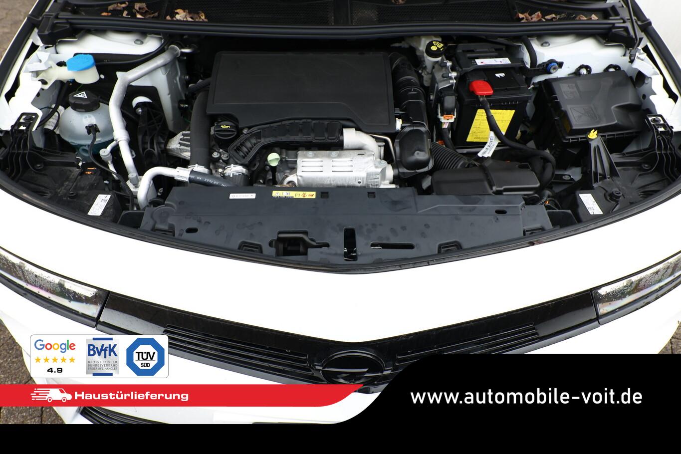 6 Lautsprecher, Airbag Beifahrerseite abschaltbar, Ambientebeleuchtung LED, Außenspiegel mit Bordsteinautomatik, Dachhimmel schwarz, Fahrassistenz-System: Intelligenter Geschwindigkeitsassistent (ISA), Fensterheber elektrisch vorn + hinten, Geschwindigkeits-Regelanlage (Tempomat), Kombiinstrument digital (10"), Lendenwirbelstütze Sitz vorn rechts, elektr. verstellbar, LM-Felgen 17" (Kadett), Navigation in Verbindung mit dem Smartphone (über Apple Carplay / Android Auto /...), Reifen 225/45 R17, Schadstoffarm nach Abgasnorm Euro 6e (EU6 EA), Sitzbezug / Polsterung: Stoff/Kunstleder, USB-Schnittstelle, Audiosystem Multimedia (Opel Connect / Freisprecheinrichtung Bluetooth / Smartphone Schnittstelle (Apple CarPlay & Android Auto)), Design-Paket: high gloss Exterieur (Dach, Design-Ausführung (schwarz) / Kühlergrill, Opel Vizor, Rahmen in Hochglanz-Schwarz / Schriftzug Heckklappe Schwarz, Hochglanz), Ergonomiesitz vorn links (Lendenwirbelstütze Sitz vorn links, elektr. verstellbar / Lenkrad heizbar / Sitz vorn links mit ausziehbarer Oberschenkelauflage / Sitzverstellung vorn links (8-fach) / Sitzverstellung vorn rechts (6-fach) / Sitzheizung vorn), Anti-Blockier-System (ABS) (Bremsassistent), Schließ-/Startsystem Keyless Open (Keyless Start), Kamerasystem 360° (Parkpilotsystem vorn und hinten), Scheinwerfer LED Eco (Einschaltautomatik für Fahrlicht / Fahrassistenz-System: Fernlichtassistent / Scheibenwischer mit Regensensor), Fahrassistenz-System: Autonomer Notbrems-Assistent mit Frontkollisionswarnung und Fußgängererkennung (Fahrassistenz-System: Verkehrszeichenerkennung / Fahrassistenz-System: aktiver Spurhalteassistent (Lenkunterstützung) / Fahrassistenz-System: Müdigkeitserkennungs-Sensor), Außenspiegel schwarz lackiert, DAB-Tuner (Radioempfang digital), Dach Diamant-Schwarz, Elektr. Bremskraftverteilung (EBD), Feststellbremse elektrisch, Karosserie: 5-türig, Motor 1,2 Ltr. - 96 kW, Otto-Partikelfilter (OPF), Sonnenblenden mit Spiegel (beleuchtet), Elektron. Stabilitäts-Programm (ESP), Getriebe 6-Gang, Klimaautomatik 2-Zonen, Airbag Fahrer-/Beifahrerseite, Isofix-Aufnahmen für Kindersitz an Rücksitz, Kopf-Airbag-System, Mittelarmlehne vorn mit Ablagefach, Seitenairbag vorn, Zentralverriegelung mit Fernbedienung, Wärmeschutzverglasung hinten abgedunkelt (Solar-Protect), Fahrassistenz-System: Berganfahr-Assistent (HSA, Hill Start Assist), Lenkrad (Leder), Außenspiegel elektr. verstell- und heizbar, elektr. anklappbar, Heckleuchten LED, Nebelscheinwerfer LED, Tagfahrlicht LED