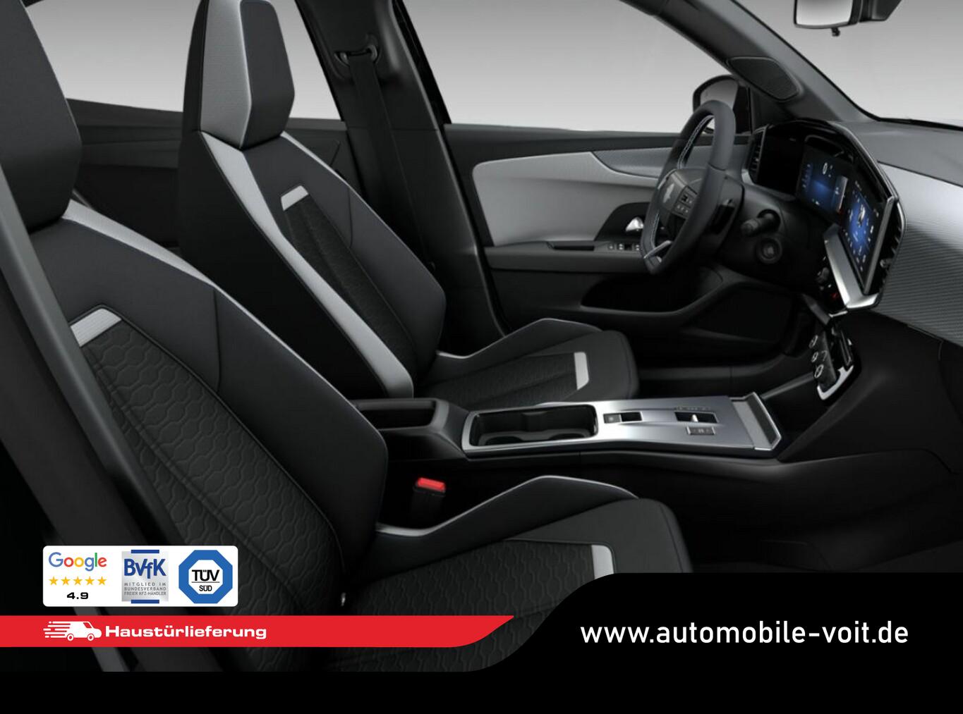 Winter-Paket (Lenkrad heizbar / Sitzheizung vorn), Parkpilotsystem hinten, Airbag Fahrer-/Beifahrerseite, Außenspiegel elektr. verstell- und heizbar, Außenspiegelgehäuse in Schwarz, Beifahrersitz 4-fach manuell einstellbar, Fahrassistenz-System: Autonomer Notbremsassistent, Fahrassistenz-System: Berganfahrassistent, Fahrassistenz-System: Spurhalteassistent, Fahrersitz 6-fach manuell einstellbar, Fensterheber elektr. vorn + hinten, Geschwindigkeits-Begrenzeranlage, Geschwindigkeits-Regelanlage (Tempomat), Isofix-Aufnahmen für Kindersitz, Kabellose Smartphone-Schnittstelle (Apple CarPlay & Android Auto), Klimaautomatik, Kombiinstrument digital (10"), Lenkrad (Kunstleder), Leseleuchten vorn und hinten, Multimedia Infotainment inkl. 10"-Touchscreen, 6 Lautsprecher, Navigation in Verbindung mit dem Smartphone (über Apple Carplay / Android Auto /...), Notrufsystem, Opel Blitz vorne in Silber, hinten und Modellname hinten in Schwarz, Reifendruckkontrollsystem, Rücksitzlehne geteilt/umklappbar (60:40), Scheibenwischer mit Regesensor, Servolenkung (elektrisch), Sommerreifen 215/65 R16, Sonnenblenden mit Spiegel, Start/Stopp System, USB-Anschluss (Typ C), Zentralverriegelung mit Fernbedienung, Bluetooth Audio-Streaming, DAB-Tuner (Radioempfang digital), Dach Wagenfarbe, Dachhimmel schwarz, Dachspoiler, Feststellbremse elektrisch, Karosserie: 5-türig, Mild-Hybrid 107 kW (Motor 1,2 Ltr. - 100 kW), Radstand 2557 mm, Sitzbezug / Polsterung: Stoff, Stahlfelgen 6,5x16, Freisprecheinrichtung Bluetooth, Anti-Blockier-System (ABS), Antriebsart: Frontantrieb, Elektron. Stabilitäts-Programm Plus (ESP), Getriebe Automatik - Doppelkupplungsgetriebe (6-Stufen, Hybrid), Kopf-Airbag-System, Seitenairbag vorn, Fahrassistenz-System: Verkehrszeichenerkennung, Einschaltautomatik für Fahrlicht, Fahrassistenz-System: Fernlichtassistent, Heckleuchten LED, Scheinwerfer LED, Tagfahrlicht LED, Fahrassistenz-System: Müdigkeitserkennungs-Sensor