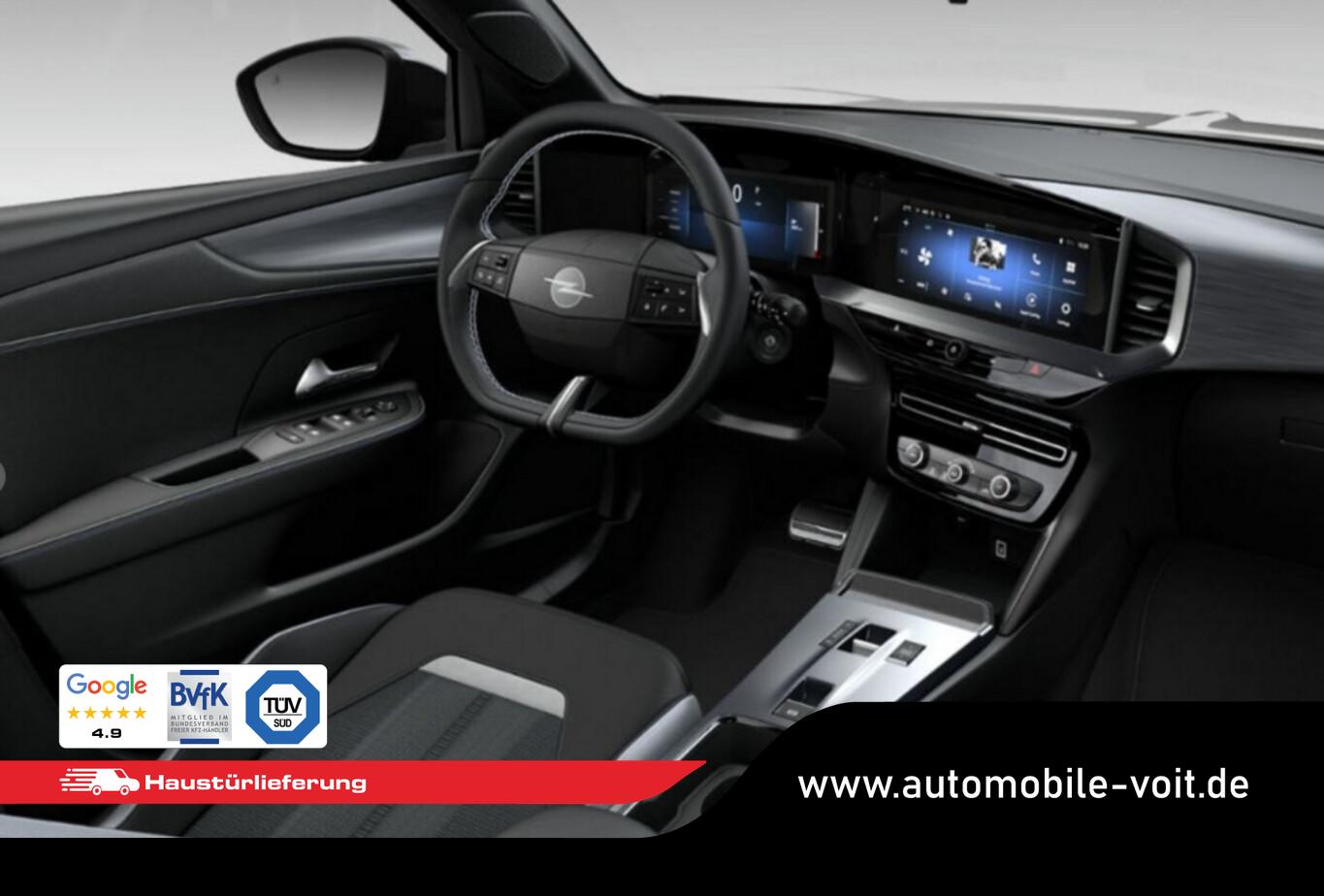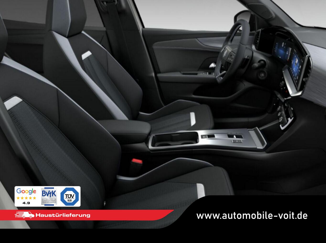 Komfort-Paket (Gepäck-/Laderaumboden doppelt / Lenkrad heizbar / Sonnenblenden mit Spiegel (beleuchtet) / Sitzheizung vorn / Lenkrad (Leder, vegan) mit Multifunktion), 10"-Touchscreen, 2 USB-Ladeschnittstellen an der Mittelarmlehne, hinten, Außenspiegel elektr. verstell- und heizbar, Fahrassistenz-System: Fußgängererkennung, Fahrassistenz-System: Spurhalteassistent, Geschwindigkeits-Begrenzeranlage, Geschwindigkeits-Regelanlage (Tempomat), Kombiinstrument digital (10"), LM-Felgen 6,5x17, Mittelarmlehne vorn, Reifen 215/60 R17, Schadstoffarm nach Abgasnorm Euro 6e (EU6 EA), Scheinwerfer Eco-LED, Audiosystem Multimedia (6 Lautsprecher / Smartphone Schnittstelle (Apple CarPlay & Android Auto)), Black-Paket (Dach, Design-Ausführung (schwarz) / Kühlergrill, Opel Vizor, Rahmen in Hochglanz-Schwarz / Schriftzug Heckklappe Schwarz, Hochglanz), Sicht-Paket (Innenspiegel mit Abblendautomatik / Einschaltautomatik für Fahrlicht mit Tunnelerkennung / Scheibenwischer mit Regensensor), Parkpilotsystem hinten (Rückfahrkamera mit 180° Umgebungsansicht), Dach Diamant-Schwarz, Fahrzeugschlüssel (2) beide klappbar, Karosserie: 5-türig, Mild-Hybrid 107 kW (Motor 1,2 Ltr. - 100 kW), Radstand 2557 mm, Anti-Blockier-System (ABS), Antriebsart: Frontantrieb, Elektron. Stabilitäts-Programm Plus (ESP), Getriebe Automatik - Doppelkupplungsgetriebe (6-Stufen, Hybrid), Klimaautomatik, Sitzbezug / Polsterung: Stoff / Ledernachbildung, Wärmeschutzverglasung hinten abgedunkelt (Solar-Protect), Fahrassistenz-System: Verkehrszeichenerkennung, Fahrassistenz-System: Fernlichtassistent, Heckleuchten LED, Tagfahrlicht LED, Fahrassistenz-System: Müdigkeitserkennungs-Sensor