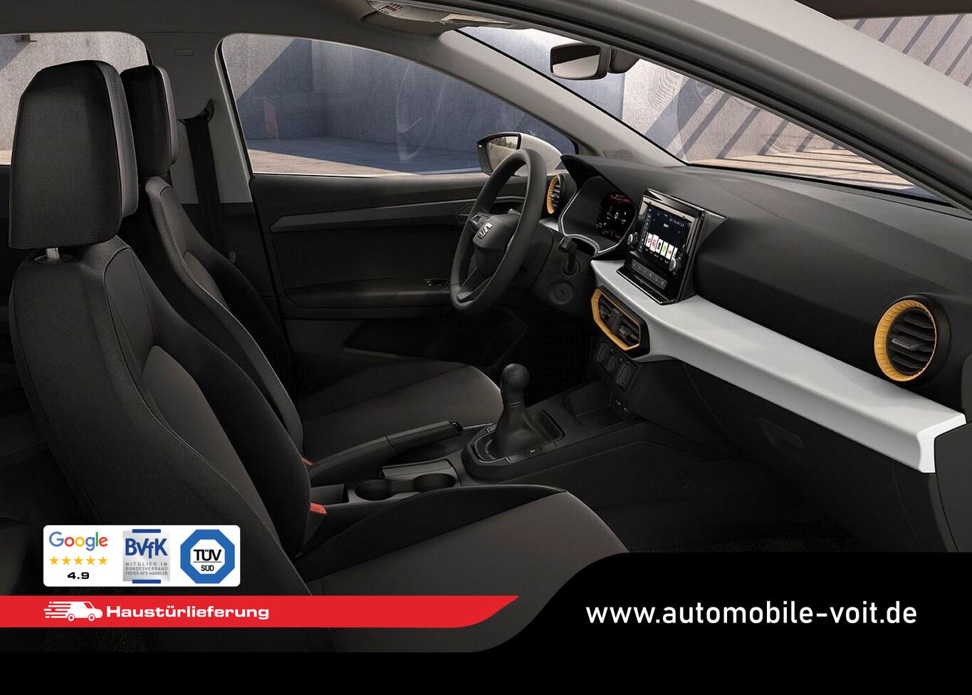 Klimaanlage, Einparkhilfe hinten, Geschwindigkeits-Regelanlage (Tempomat), Full Link (MirrorLink, Apple CarPlay und Android Auto), 8,25"-Touchscreen, Leselampen vorn, LM-Felgen 5,5x15, Navigation in Verbindung mit dem Smartphone (über Apple Carplay / Android Auto /...), Nebelscheinwerfer, Reifen 185/65 R15, Schadstoffarm nach Abgasnorm Euro 6e (EU6 EA), Sitz vorn links höhenverstellbar, SEAT Media-System (Audiosystem mit Touchscreen-Farbdisplay / Bluetooth Audio-Streaming / Mobile Online Dienste Seat Connect / Bluetooth-Schnittstelle mit Freisprecheinrichtung integriert / USB-Schnittstelle vorn (2-fach, Typ C)), 3. Bremsleuchte, Außenspiegel und Türgriffe außen in Wagenfarbe, Elektr. Bremskraftverteilung, Karosserie: 5-türig, Kombiinstrument digital (8 Zoll), Kopfstützen hinten, Kopfstützen vorn, Motor 1,0 Ltr. - 59 kW, Otto-Partikelfilter (OPF), Radioempfang digital (DAB+), Anti-Blockier-System (ABS), Antriebs-Schlupfregelung (ASR), Elektron. Differentialsperre (EDS), Elektron. Stabilitäts-Programm (ESP), Elektron. Stabilitätskontrolle (ESC), Wegfahrsperre (elektronisch), Getriebe 5-Gang, Airbag Beifahrerseite abschaltbar, Airbag Fahrer-/Beifahrerseite, Fensterheber elektrisch vorn, Isofix-Aufnahmen für Kindersitz, Kopf-Airbag-System, Rücksitzbank / Lehne kpl. klappbar, Seitenairbag, Zentralverriegelung mit Fernbedienung, Fahrassistenz-System: Berganfahr-Assistent (Hill-Holder), Lenkrad mit Multifunktion, Servolenkung elektronisch gesteuert (Servotronic), Heckleuchten LED, Scheinwerfer LED, Tagfahrlicht, Fahrassistenz-System: Ablenkungs- und Müdigkeitserkennung, Fahrassistenz-System: Spurhalteassistent, Fahrassistenz-System: Umfeldbeobachtungssystem (Front assist) mit City-Notbremsfunktion, Reifenkontroll-Anzeige, Start/Stop-Anlage