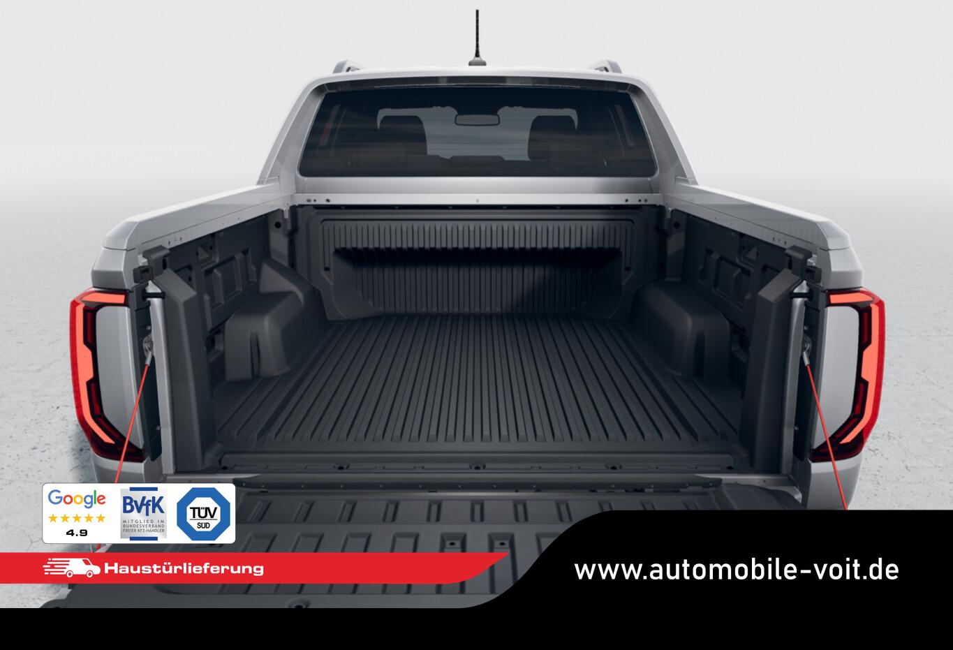 Laderaumjalousie (Roll Cover System elektrisch, Pick-Up), Zusatzheizung / Standheizung mit Funkfernbedienung, LM-Felgen 8,5x21 (Varberg) (Reserverad in Fahrbereifung (Leichtmetall)), Dachreling silber, Unterfahrschutz Motor / Verteilergetriebe aus Stahl, für Tank aus Kunststoff, Reifen 275/45 R21, Laderaumauskleidung Kunststoff (Steckdose 12V im Koffer-/Laderaum), Vorbereitung für VW Connect (Vorbereitung Onlinedienste), LM-Felgen 8x20 (Bendigo) (Reserverad in Fahrbereifung (Leichtmetall)), 2.Sitzreihe Sitzbank (3 Sitzplätze), Ambiente-Beleuchtung weiß, Anhängersteckdose 13-polig, Antennen-Diversity, Armaturentafel Kunstleder, Außenspiegel und Türgriffe außen verchromt, Ausstattung Aventura, Dachhimmel Stoff, schwarz, Diebstahlsicherung für Räder (Felgenschlösser), Digital Cockpit (Farbdisplay 12,3 Zoll), Fahrassistenz-System: Multikollisionsbremse (Multi Collision Brake), Federung Komfort, Funkschlüssel / Handsender (2), Haltegriff A-Säule, Beifahrerseite, Handschuhfach abschließbar und beleuchtet, Heckklappe abschließbar über Zentralverriegelung (Pick-Up), Heckklappengriff Wagenfarbe (Pick-Up), Heckscheibe heizbar, Induktionsladeschale für Smartphone (Wireless Charging), Infotainment-System mit Touchscreen-Farbdisplay 12 Zoll für Navigation, Innenraumfilter: Staub- und Pollenfilter, Innenspiegel mit Abblendautomatik, Karosserie/Aufbau: Doppelkabine (Double-Cab), Karosserie/Aufbau: Pick-Up, Kopfstützen hinten (3-fach), Kühlergrill schwarz mit Chromleiste, Ladeflächenbeleuchtung LED (außen), Leseleuchten vorn und Brillenfach, Leuchtweitenregelung automatisch, Mittelarmlehne hinten, Motor 3,0 Ltr. - 177 kW V6 TDI, Parkbremse elektrisch, Radioempfang digital (DAB+), Radstand Standard, Schalt-/Wählhebelgriff Leder, Schmutzfänger vorn und hinten, Sitz vorn links mit Kartentasche, Sonnenblenden mit Spiegel (beleuchtet), Sound-System Harman-Kardon (8 Lautsprecher, Subwoofer, 640 Watt), Sportsbar in Wagenfarbe, Steckdose 120V / 230V in Mittelkonsole hinten und Ladefläche, Stoßfänger hinten schwarz unlackiert mit Chrom-Applikationen, Stoßfänger vorn Wagenfarbe (X-Design), Trittbretter seitlich mit Chromeinlage, Türgriffe innen verchromt, Umfeldbeleuchtung über Infotainment-System einstellbar, Vorbereitung Online Diebstahl-Warnanlage, Warnanlage für Sicherheitsgurte vorn und hinten, Navigationsfunktion, USB-Ladeanschluß (1) am Innenspiegel, Anhängerkupplung (Kugelkopf abnehmbar), Anti-Blockier-System (ABS), Antriebsart: Allradantrieb, Differentialsperre (Hinterachse), Elektron. Stabilitäts-Programm (ESP) mit Bremskraftverstärker elektro-mechanisch, Getriebe Automatik - (10-Stufen), Klimaanlage Climatronic 2-Zonen, Airbag und Knieairbag Fahrer-/Beifahrerseite, Beifahrerairbag abschaltbar, Kindersitzerkennung, Fensterheber elektrisch vorn und hinten, Isofix-Aufnahmen für Kindersitz an Rücksitze (inkl. i-Size-Kindersitze), Schließ-/Startsystem Keyless Access mit Safesicherung, Seitenairbag vorn mit Center-Airbag, Kopf-Airbag-Einheit vorn und hinten, Seitenscheiben hinten und Heckscheibe abgedunkelt, Sitzbezug / Polsterung: Leder Savona, Sitze vorn elektr. verstellbar (10-Wege), Sitzheizung vorn, Verzurrösen auf Ladefläche / Laderaumboden, Zentralverriegelung, Fahrassistenz-System: Fahrprofilauswahl, Frontscheibe Dämmglas, Fahrassistenz-System: Autom. Distanzregelung (ACC inkl. Stop&Go-Funktion), Fahrassistenz-System: Verkehrszeichenerkennung, Rückfahrkamera (Rear View), Notrufsystem, Lenkrad (Leder) mit Multifunktion, Außenspiegel elektr. verstell-, heiz- und anklappbar und Umfeldleuchte, Fahrassistenz-System: Dynamische Fernlichtregulierung (Dynamic Light Assist), Fahrassistenz-System: Fernlichtregulierung (Light Assist), Heckleuchten LED, Matrix-LED-Scheinwerfer (IQ.Light), Nebelscheinwerfer LED, Scheibenwischer mit Regensensor, Einparkhilfe vorn und hinten inkl. Auspark-Assistent, Fahrassistenz-System: Notbremsassistent Front assist mit Fußgänger- und Fahrraderkennung, Fahrassistenz-System: Spurhalteassistent (Lane Assist) inkl. Side Assist, Reifendruck-Kontrollsystem, Rußpartikelfilter