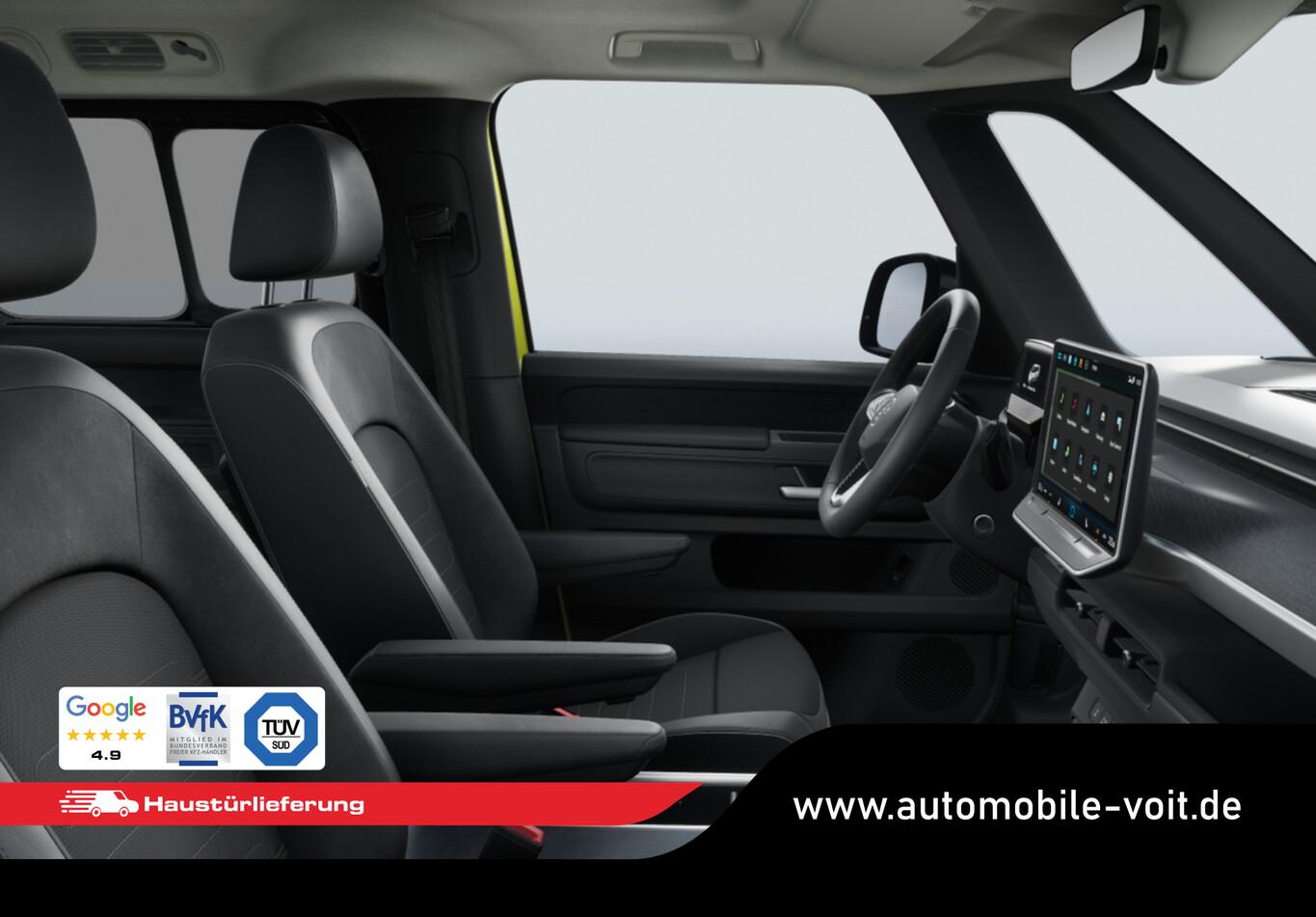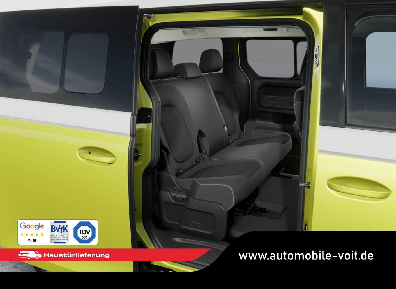 Ausstattungs-Paket: Easy Open & Close Plus (Fenster im Lade-/FG-Raum: - schiebbar, vorn links / Fenster im Lade-/FG-Raum: - schiebbar, vorn rechts / Schließ-/Startsystem Keyless Advanced mit Safesicherung / Umfeldleuchte in Heckklappe / Heckklappe elektr. betätigt Easy Open (öffnen + schliessen, sensorgesteuert) / Schiebetür Lade-/Fahrgastraum links elektr. betätigt Easy Open (sensorgesteuert) / Schiebetür Lade-/Fahrgastraum rechts elektr. betätigt Easy Open (sensorgesteuert)), Interieur-Paket Style Plus (Lenkrad schwarz) (Ambiente-Beleuchtung (30 Farben) / Sitzbezug / Polsterung: Stoff Seaqual / Sitze im Fahrerhaus: Fahrer- und Beifahrersitz Komfort / Sitze im Fahrerhaus: Fahrer- und Beifahrersitz mit Armlehnen beidseitig / Sitze vorn mit Massagefunktion / Sitze im Fahrerhaus: Fahrer- und Beifahrersitz elektr. verstellbar mit Memory, Einstiegshilfe links / Sitze im Fahrerhaus: Fahrer- und Beifahrersitz heizbar / Lenkrad heizbar (Leder) mit Multifunktion), Ausstattungs-Paket: Komfort-Paket Plus (Außenspiegel schwarz lackiert und Türgriffe außen in Wagenfarbe / Gepäckraum-Abtrennung / Trennnetz / Gepäckraumabdeckung / Rollo / Innenspiegel mit Abblendautomatik / Mittelkonsole vorn variabel (ID.Buzz Box) / Multiflex-Board / Scheibenwaschdüsen beheizt / Multimedia-Schnittstelle 2 x USB (Typ C) vorn, USB-Ladeanschluß (Typ C) 1 x vorn, hinten / Klimaanlage Climatronic 3-Zonen inkl. Fondbedienung / Sitze im Fahrerhaus: Fahrer- und Beifahrersitz heizbar / Lenkrad heizbar (Leder) mit Multifunktion / Regensensor), LM-Felgen vorn/hinten: 8x19 / 9x19 (Tilburg, schwarz glanzgedreht), Fahrassistenz-Paket Plus inkl. Travel Assist und Umgebungsansicht inkl. Rückfahrkamera (Schließ-/Startsystem Keyless Advanced mit Safesicherung / Türgriffschalen außen beleuchtet / Rückfahrkamera mit 360° Umgebungsansicht (Area View) / Lenkrad heizbar (Leder) mit Multifunktion / Fahrassistenz-System: Memoryfunktion für Park Assist / Fahrassistenz-System: Parklenkassistent (Park Assist) inkl. Einparkhilfe vorn und hinten / Fahrassistenz-Paket: Travel Assist, Emergency Assist und Lane Assist / Diebstahl-Warnanlage + Innenraumüberwachung / Abschleppschutz + Back-up-Horn), Ausstattungs-Paket: Design (Leuchtweitenregelung automatisch und Kurvenlicht dynamisch / Lichtleiste zwischen Scheinwerfer / Pedale Edelstahl / Fahrassistenz-System: Dynamische Fernlichtregulierung (Dynamic Light Assist) / Heckleuchten LED, Blinkleuchten dynamisch / Matrix-LED-Scheinwerfer (IQ.Light)), Heizungs-/Klimaanlage: Wärmepumpe, Anhängerkupplung klappbar (elektr. Entriegelung), Ladekabel mit Schukostecker (10 A, Mode 2), Ladekabel mit Typ 2-Stecker (32 A, Mode 3), Fahrassistenz-System: Parklenkassistent (Park Assist Pro) inkl. Einparkhilfe in Verbindung mit Onlinedienste, Diebstahl-Warnanlage + Innenraumüberwachung / Abschleppschutz, Elektron. Stabilitäts-Programm (ESP), Garantieverlängerung: 3 Jahre oder 100.000 km, Isofix-Aufnahmen für Kindersitz am Beifahrersitz, Navigation in Verbindung mit dem Smartphone (über Apple Carplay / Android Auto /...), Radschrauben mit Diebstahlsicherung, Scheibenwischer mit Intervallschaltung, Sommerreifen hinten 255/50 R19, Sommerreifen vorn 235/55 R19, Akustischer Fußgängerschutz, Außensound (e-sound), Audiosystem Ready 2 Discover (Touchscreen-Farbdisplay 12,9 Zoll), Audiosystem: Vorbereitung für spätere Freischaltung Navigationsfunktion Discover Pro, Außenspiegel konvex, links und rechts, Bidirektionales Laden (DC), Bodenbelag: Teppich verstärkt, DC / DC Wandler 3 kW, Elektromotor 210 kW (cont. 89 kW), Fahrassistenz-System: Ausweich-Assistent und Abbiege-Assistent, Funkschlüssel (2), Fußraumbeleuchtung vorn und hinten, Heckklappe mit Verglasung, Heckscheibenwischer mit Intervallschaltung, HV-Batterie 79 kWh netto, Innenausstattung: Bedienelemente, Lenkrad und Einfassung Instrumente schwarz, Innenleuchten im Lade-/FG-Raum: LED (Gepäckraum), Insassen-Schutzsystem proaktiv, Intelligent Speed Assist inkl. Geschwindigkeitsbegrenzer, Karosserie/Aufbau: Bus, Lautsprecher (9), Linkslenker, Mobile Online Dienste App-Connect inkl. App-Connect Wireless (Apple CarPlay, Android Auto), Nichtraucher-Paket, Radioempfang digital (DAB+), Radstand 2989 mm, Radstand kurz, Schnellladevorrichtung (CCS-Ladedose), Sitzausstattung: 5-Sitzer, Sitze im Lade-/FG-Raum: 1.Reihe, 3er-Sitzbank, geteilt/klappbar, Sonnenblenden mit Spiegel (beleuchtet), Steckdose (12V-Anschluß) im Laderaum, Stoßfänger in Wagenfarbe, Umfeldbeleuchtung seitlich mit Projektionsfunktion, Vorbereitung für Alkohol-Wegfahrsperre (Alcolock), Vorbereitung Onlinedienste We Connect (Plus) oder VW Connect (Plus) und Online-Update-Fähigkeit, Warnanlage für Sicherheitsgurte vorn und hinten, Zul. Gesamtgewicht 3,00 t, Mobiltelefon Schnittstelle Bluetooth, Mobiltelefon Schnittstelle mit kabelloser Ladefunktion, Anti-Blockier-System (ABS), Antriebsart: Heckantrieb, Getriebe für Elektrofahrzeug, Airbag Fahrer-/Beifahrerseite, Beifahrerairbag abschaltbar, Isofix-Aufnahmen für Kindersitz an Rücksitz, Seitenairbag, Kopfairbag und Center-Airbag vorn, Wärmeschutzverglasung seitlich / hinten, Fahrassistenz-System: Autom. Distanzregelung (ACC inkl. Stop&Go-Funktion), Fahrassistenz-System: Verkehrszeichenerkennung, Multifunktionskamera / Frontkamera, Notrufsystem, Servolenkung elektro-mechanisch, geschwindigkeitsabhängig, Außenspiegel elektr. verstell-, heiz- und anklappbar mit Spiegelabsenkung, Fahrassistenz-System: Ablenkungs- und Müdigkeitserkennung, Fahrassistenz-System: Notbrems-Assistent (Front Assist) inkl. Fußgänger- und Fahrraderkennung, Fahrassistenz-System: Spurhalteassistent (Lane Assist), Fahrassistenz-System: Spurwechselassistent (Side Assist) mit Auspark-Assistent und Ausstiegswarnung, Reifenkontroll-Anzeige