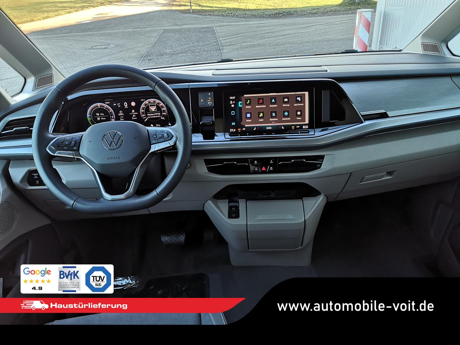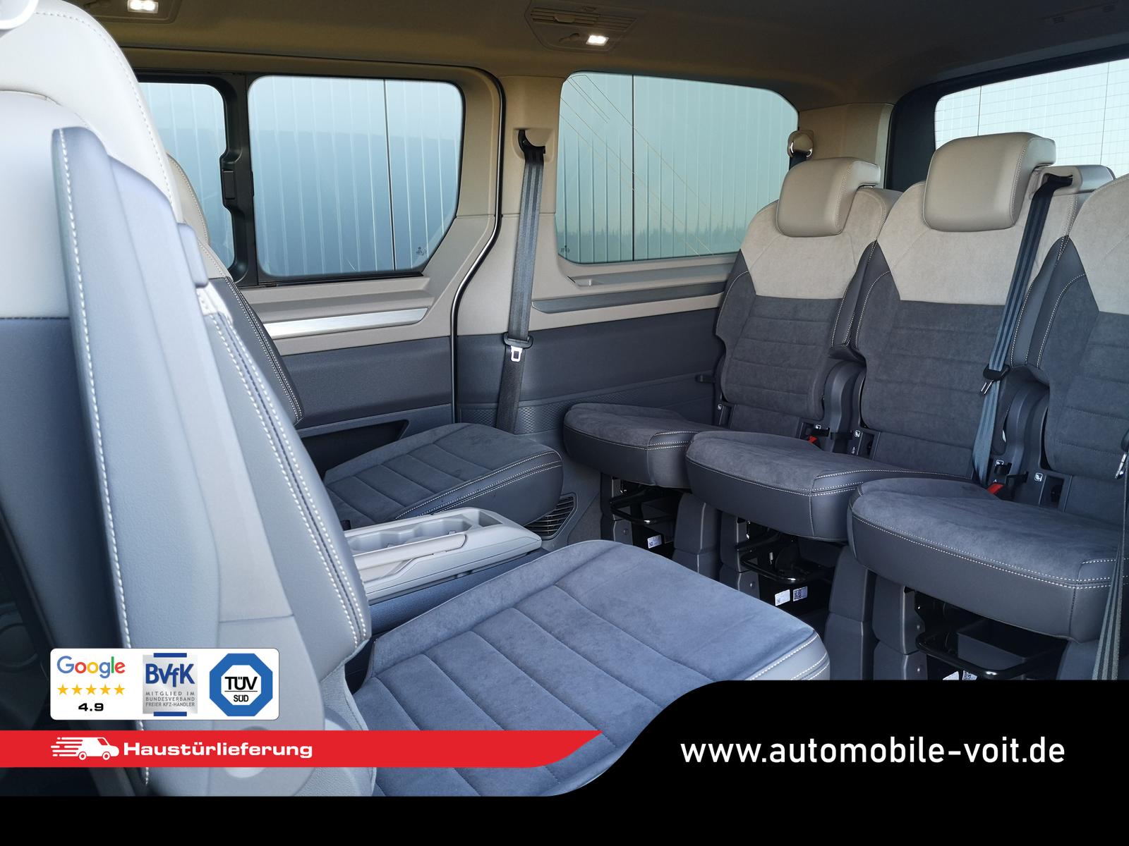 Fahrzeug 8-fach-bereift, Leichtmetallräder 7,5J x 18 (Sport Edition Design TN28, schwarz glanzgedreht) mit Sommerreifen 235 50 R18, Leichtmetallräder 7,5 J x 18 ""Toshima"" schwarz mit Winterreifen (M+S Kennung inkl. Schneeflocke / Allwetterreifen), (0NP) Bulliplakette am Kotflügel, (1U3) Bodenschienen mit Multifunktionstisch inkl. 3 Becherhalter, verschiebbar auf der vollständigen Länge des Schienensystems, (2FT) Multifunktionslederlenkrad beheizbar mit Schaltwippen, (4A3) Sitzheizung vorne, (4GX) Frontscheibe beheizbar und geräuschdämmend, (4K5) Zentralverriegelung Keyless Advance (schlüsselloses Öffnen und Starten),(6I6) Travelassistent, (6KF) Scheinwerferleiste hinterleuchtet, (7AL) Diebstahlwarnanlage, (7J2) Digital Cockpit Pro, (7UY) Radio Navigationssystem Discover Pro, (9AH) Klimaanlage ""Air Care Climatronic"", (N2S) Sitzbezug Bi-Colour ""ArtVelours"", (Z2Q) Anhängerrangierassistent ""Trailer Assistent"" inkl. Anhängerkupplung schwenkbar, Parklenkassistent inkl. Rückfahrkamera, (Z8A) Schiebefenster im Fahrgastraum links und rechts, Fenster ab B-Säule abgedunkelt, ABT Leistungssteigerung auf 132kW/180PS und 400Nm Drehmoment, (ZBR) 7 Sitzer: Sitzvariante 2-2-3 (Vis-a-Vis entgegen der Fahrrichtung) inkl. 4 Armlehnen.
